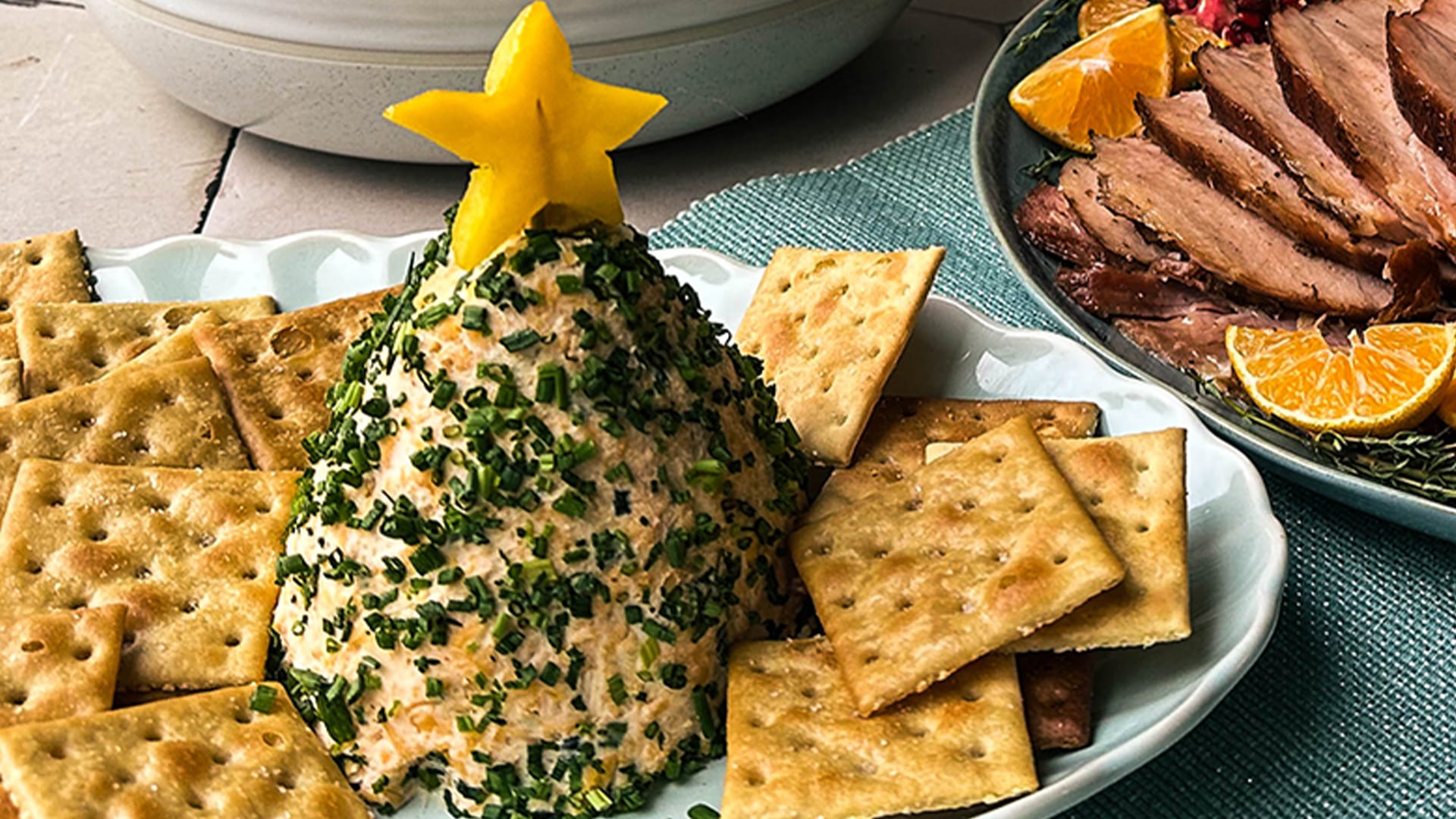 - When the cheeseball is firm, scatter the remaining 4 or 5 tablespoons of chives into a shallow dish or plate. Unwrap the cheeseball and roll in the chives to coat. Transfer to a platter topped with a yellow bell pepper star and serve alongside the butter-baked saltines.