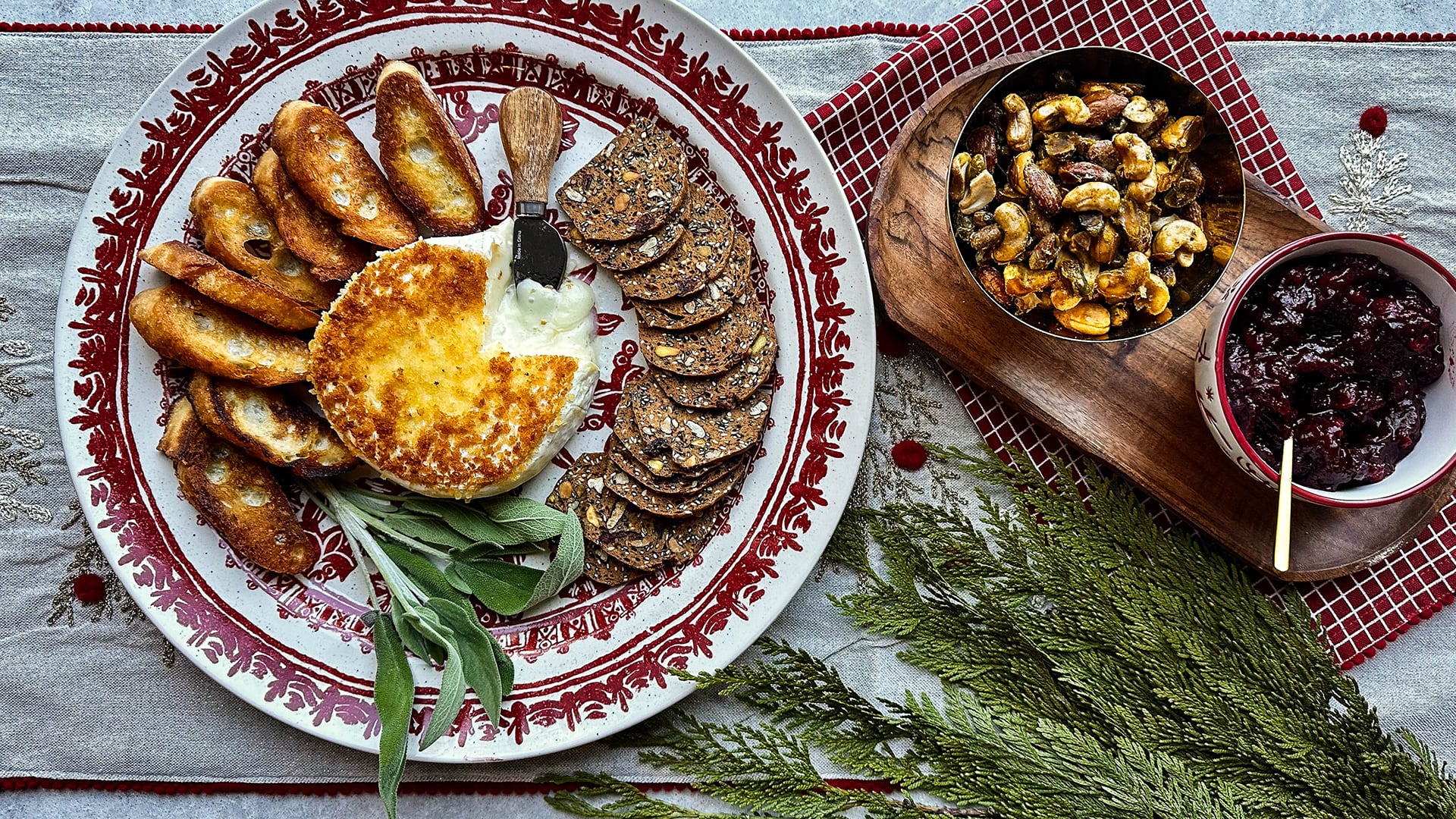 - Serve the hot cheese with the cranberry jam, spiced nuts, and baguette or crackers on the side. Enjoy!