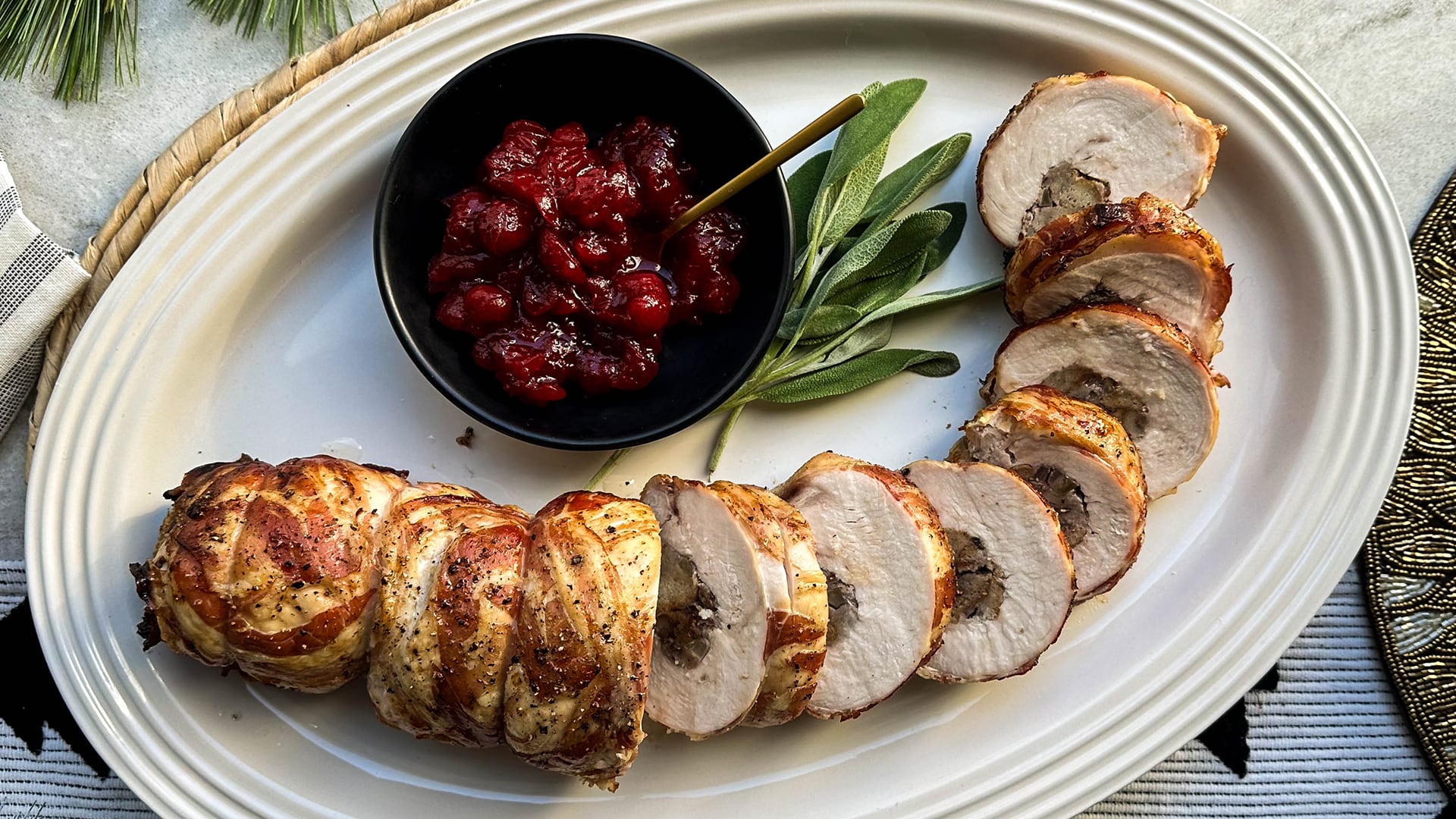 - Line a large cutting board with plastic wrap and place long pieces of kitchen twine about two inches apart horizontally along the board. Arrange the pancetta over the string, overlapping each slice to form an even layer. Lay your butterflied turkey breasts over the pancetta, arranging them to be even. Season with salt and pepper, transfer the stuffing mixture onto the turkey and lightly press it into an even layer.