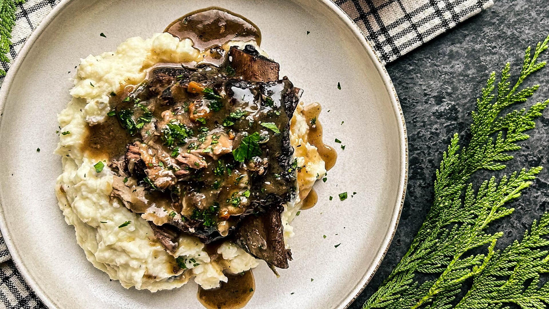 - Serve the short ribs on mashed potatoes with the reduced braising liquid spooned overtop. Enjoy!