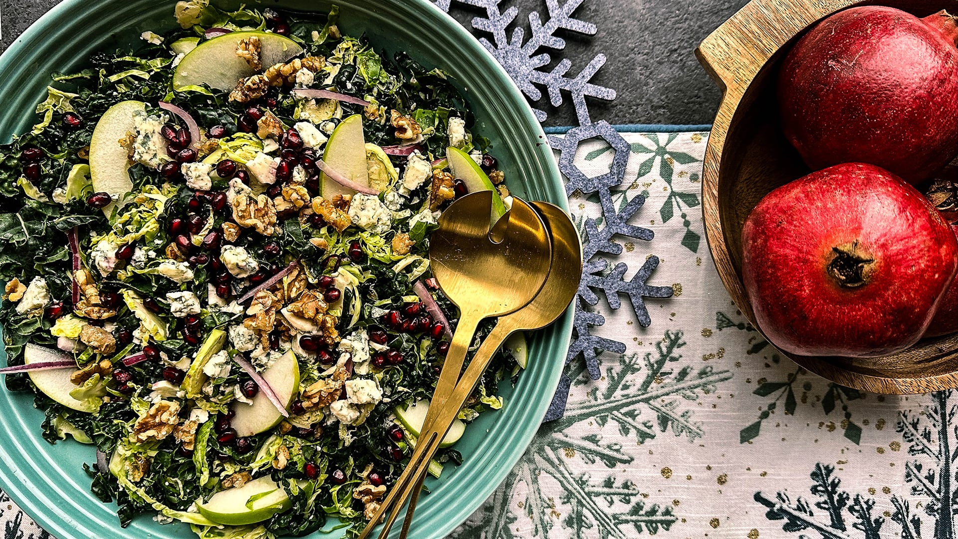 - Scatter the salad with the onion, apple, pomegranate, cheese, and candied walnuts and toss well to combine. Enjoy!