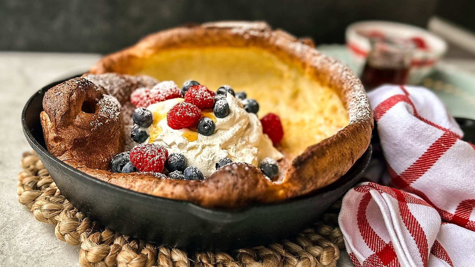 - When the oven is heated, pull the oven rack out and add the oil and butter to melt. Quickly and carefully pour the batter into the skillet, slide the rack back into position, and close the oven door. Drop the temperature to 425ºF and bake for 18 to 20 minutes or until the Dutch Baby is super puffy and golden brown.
