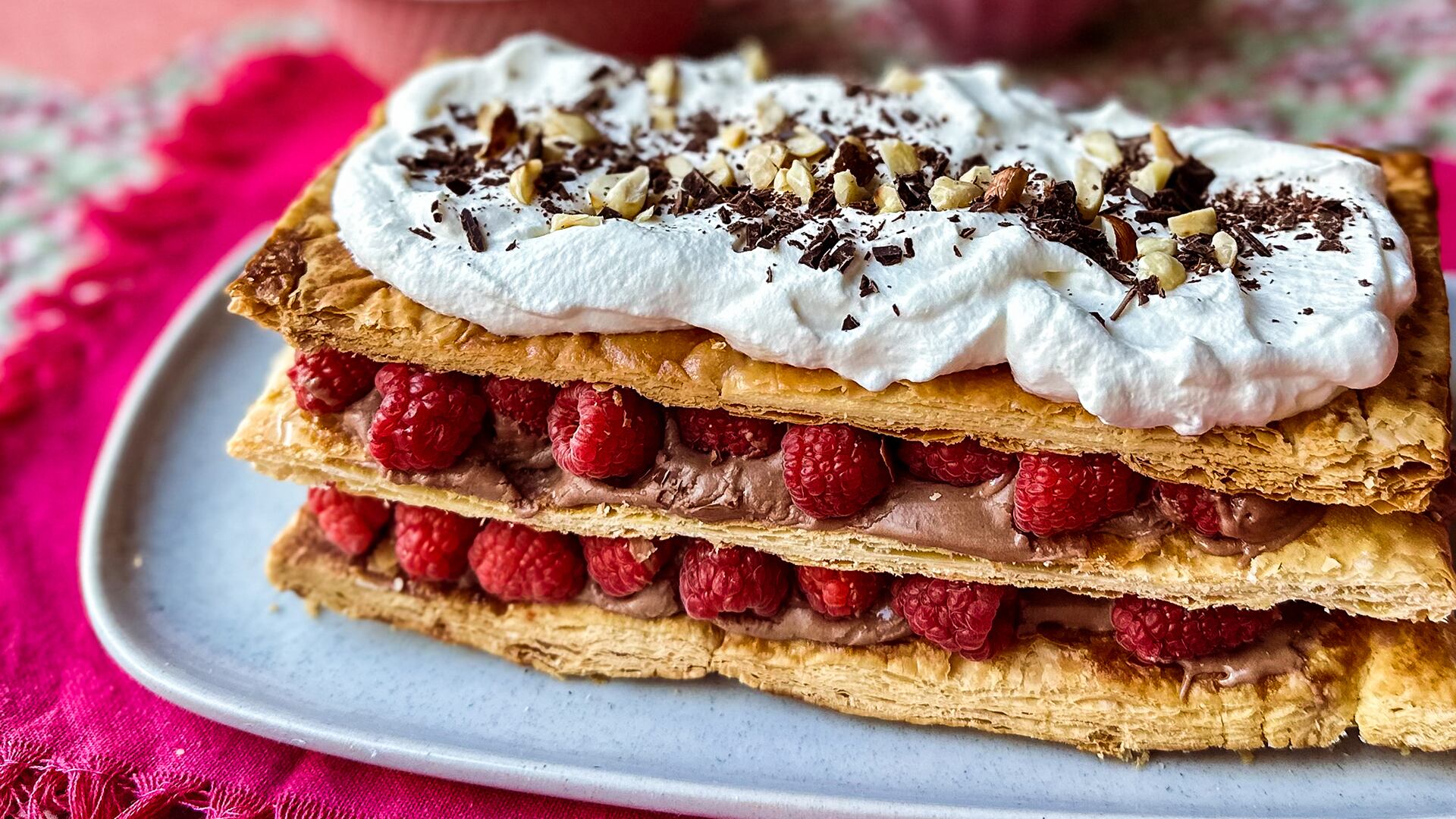 - Using a serrated knife, slice the puff pastry sheet along the long side into three equal pieces, trimming the edges if needed. Spoon a small dollop of the chocolate hazelnut cream onto the centre of a serving dish and place one of the puff pastry pieces on top. Pipe or spread half of the chocolate hazelnut cream onto the pastry and dot with about half of the raspberries. Place another puff pastry on top and repeat with the remaining chocolate hazelnut cream and raspberries. Place the final piece of puff pastry on top, dollop or pipe over the whipped cream, and scatter with the hazelnuts and chocolate shavings, if using.