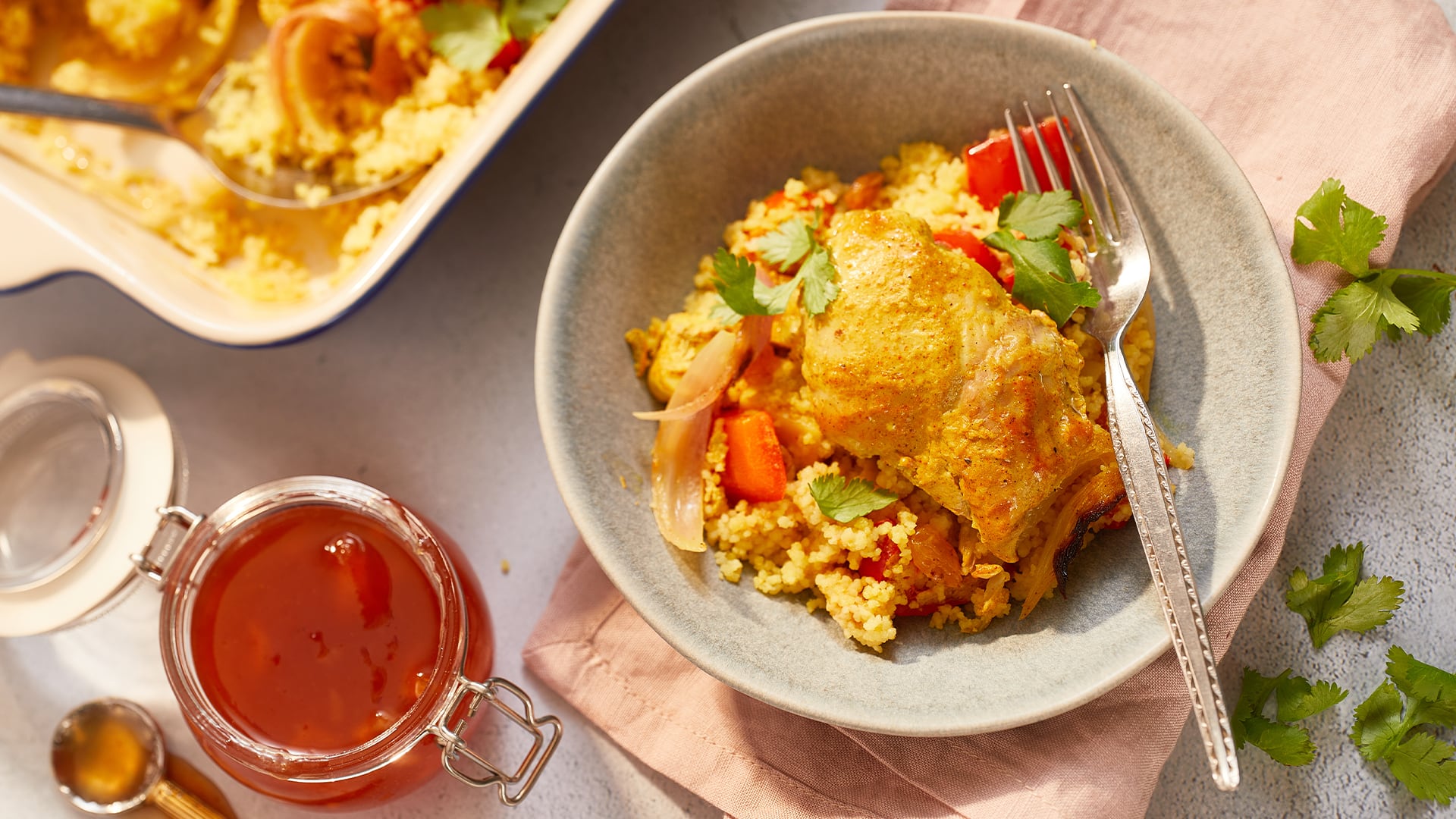 - Use a fork to fluff up the couscous, add the chicken back into the pan, and scatter with the cilantro and a squidge of lemon juice. Serve with mango chutney and yogurt on the side, if desired. Enjoy!
