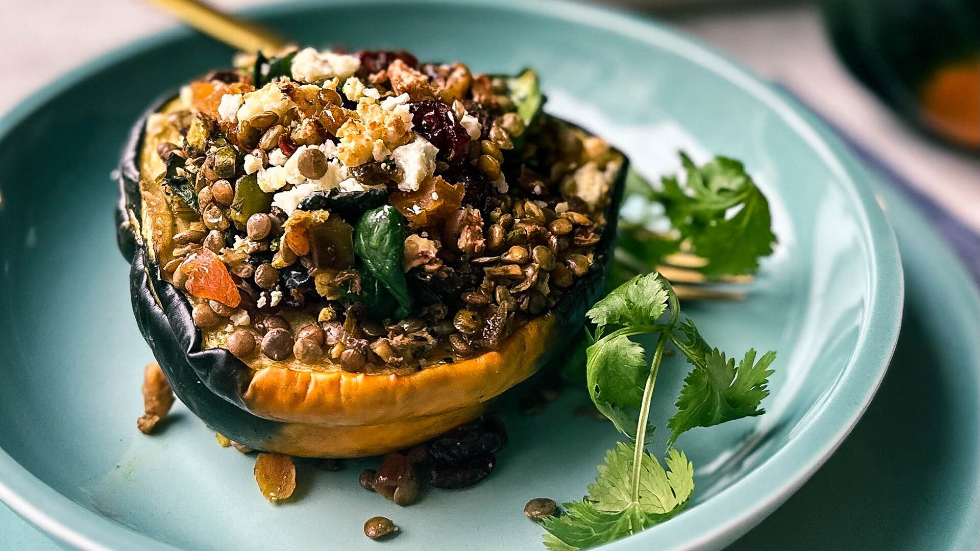 Warm up with this spiced lentil dish perfectly stuffed in tender acorn squash.