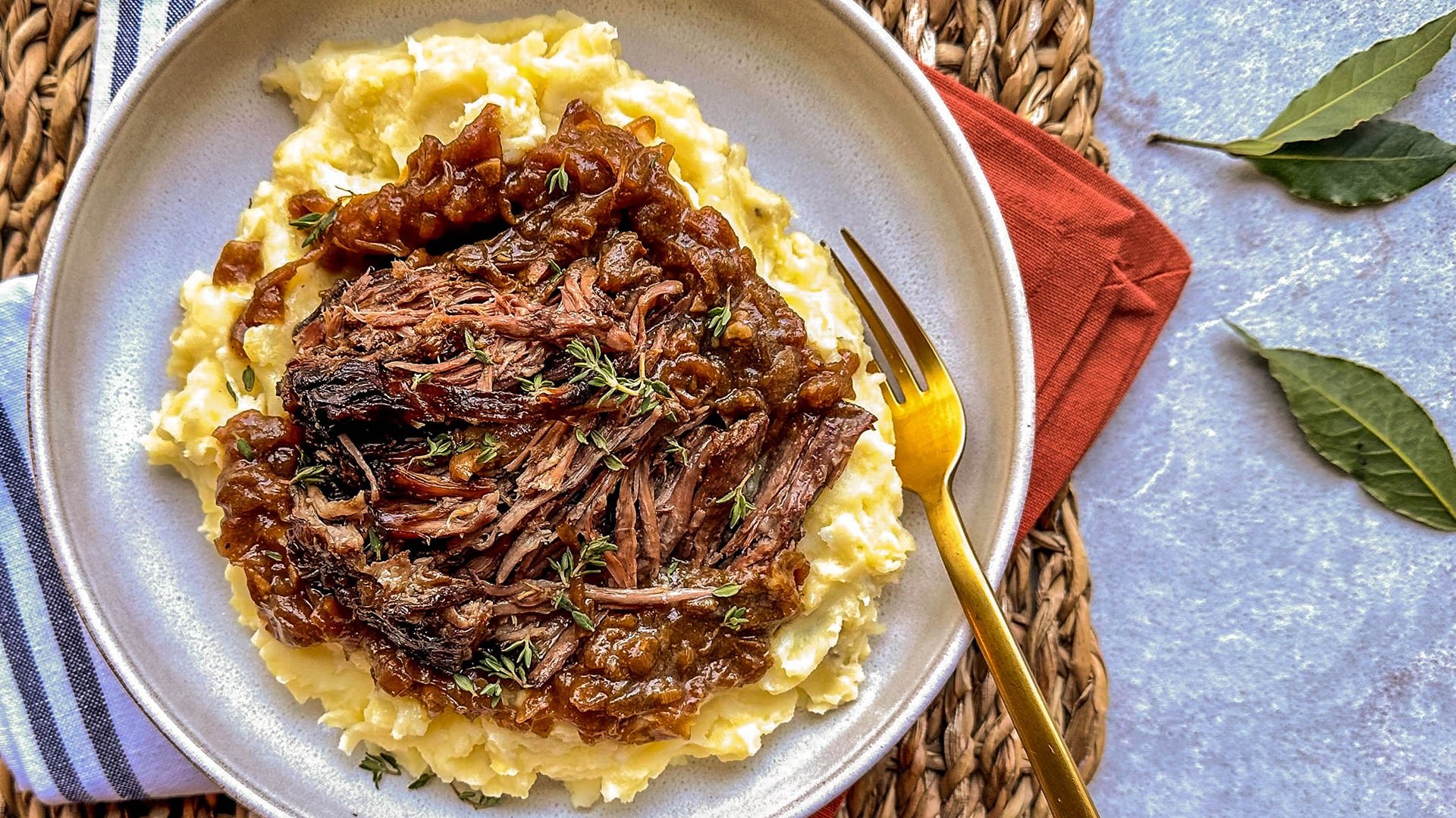 - Serve the beef in large chunks using tongs or two forks and serve over the cheesy mashed potatoes with a few ladles of onion gravy. Enjoy!