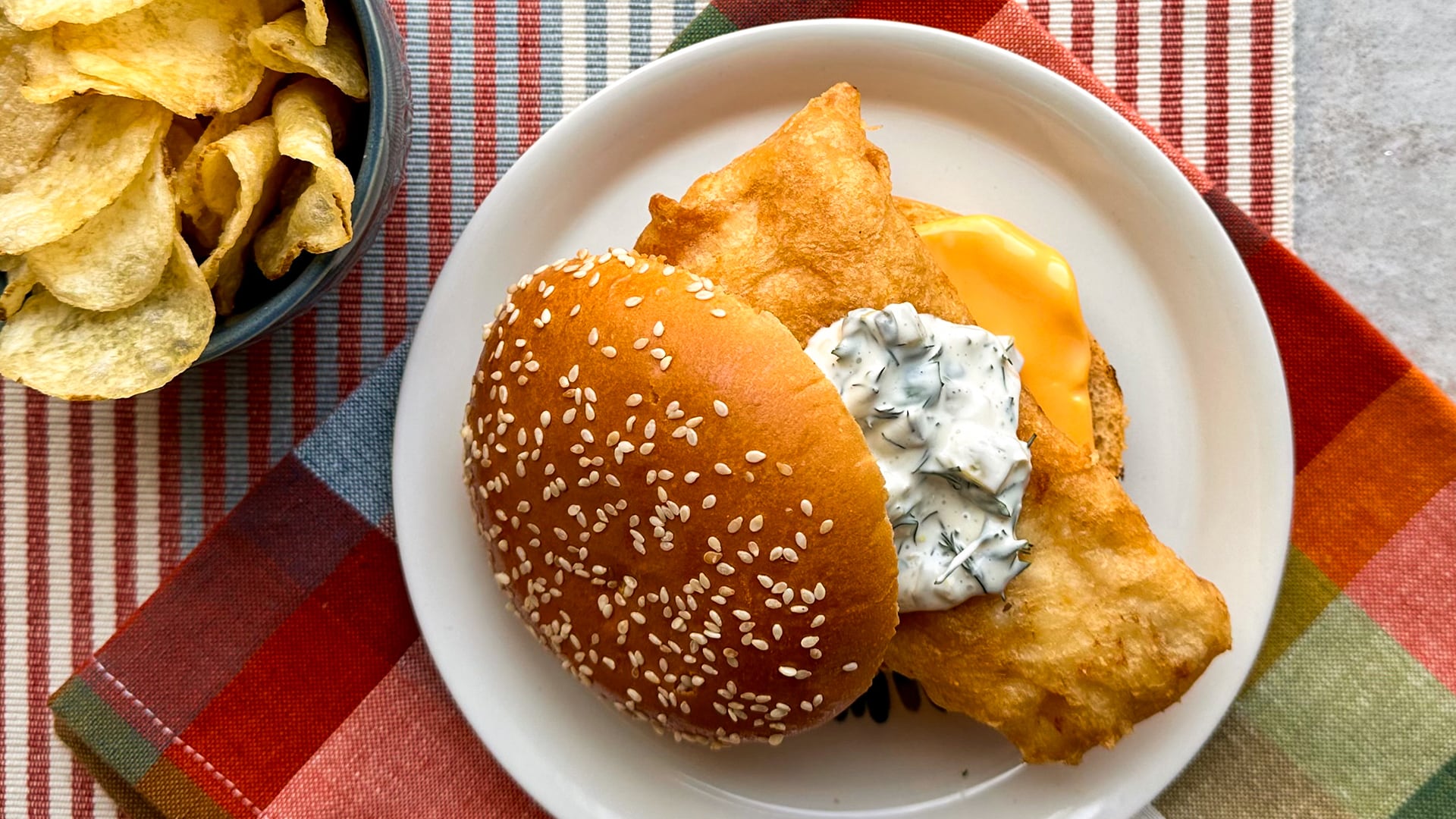 - To assemble, place a cheese slice onto the bottom of each bun and top with a piece of fish. Dollop over some tartar sauce and cap with a bun top. Serve with extra tartar sauce on the side.