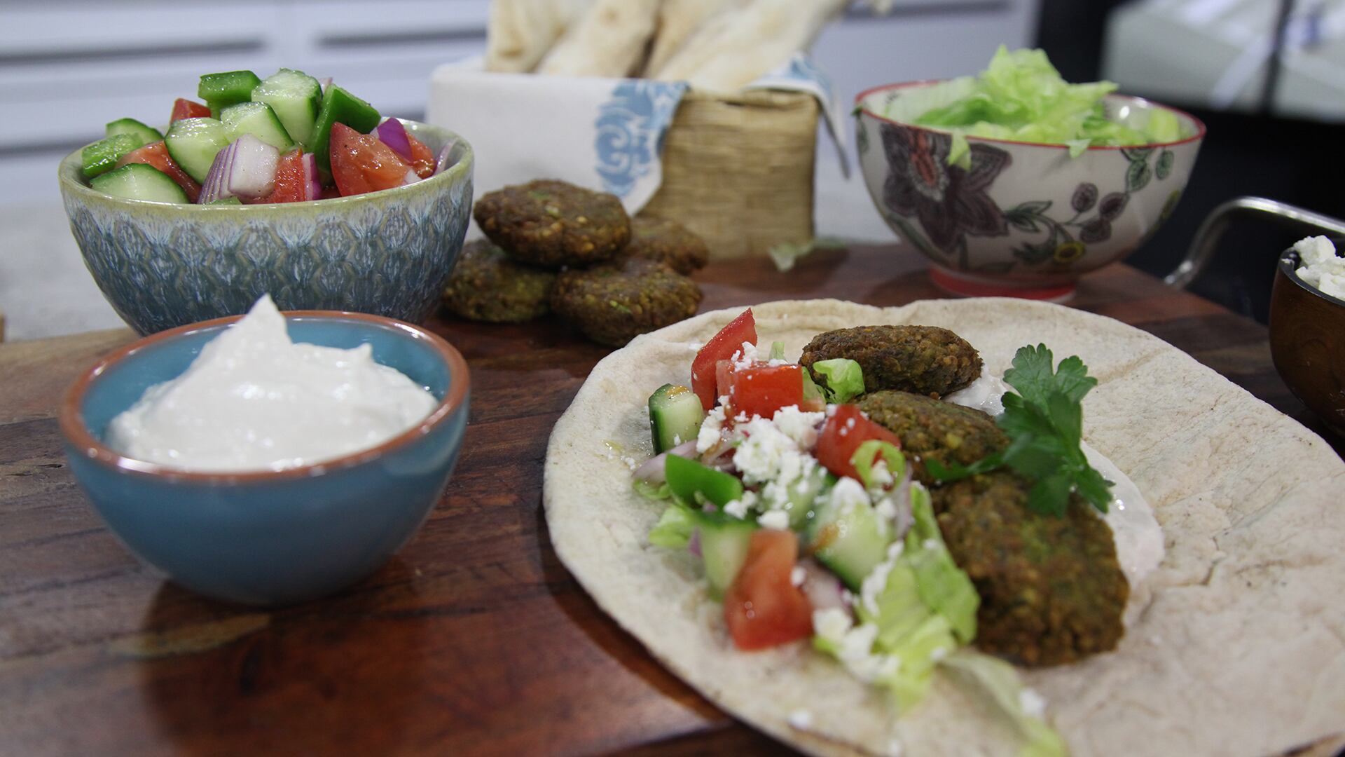 - For the falafel wraps, make a quick sauce by whisking together the yogurt, tahini, and lemon juice and season with a bit of salt and pepper. Make a little salad by combining the cucumber, tomato, bell pepper, red onion, parsley, vinegar, and olive oil and season with salt and pepper. Assemble the wraps with the lettuce, salad, falafel, feta, and sauce.