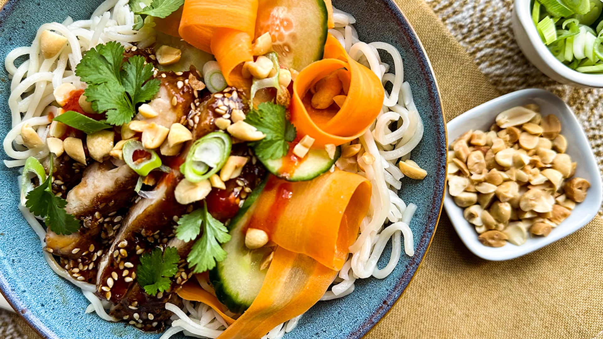 - Drain the noodles and divide them into four bowls along with the pickled veg. Slice the chicken into one centimetre-thick pieces and add on top then scatter with the green onions, cilantro, and nuts. Serve the bowls with sriracha and hoisin on the side. Enjoy!