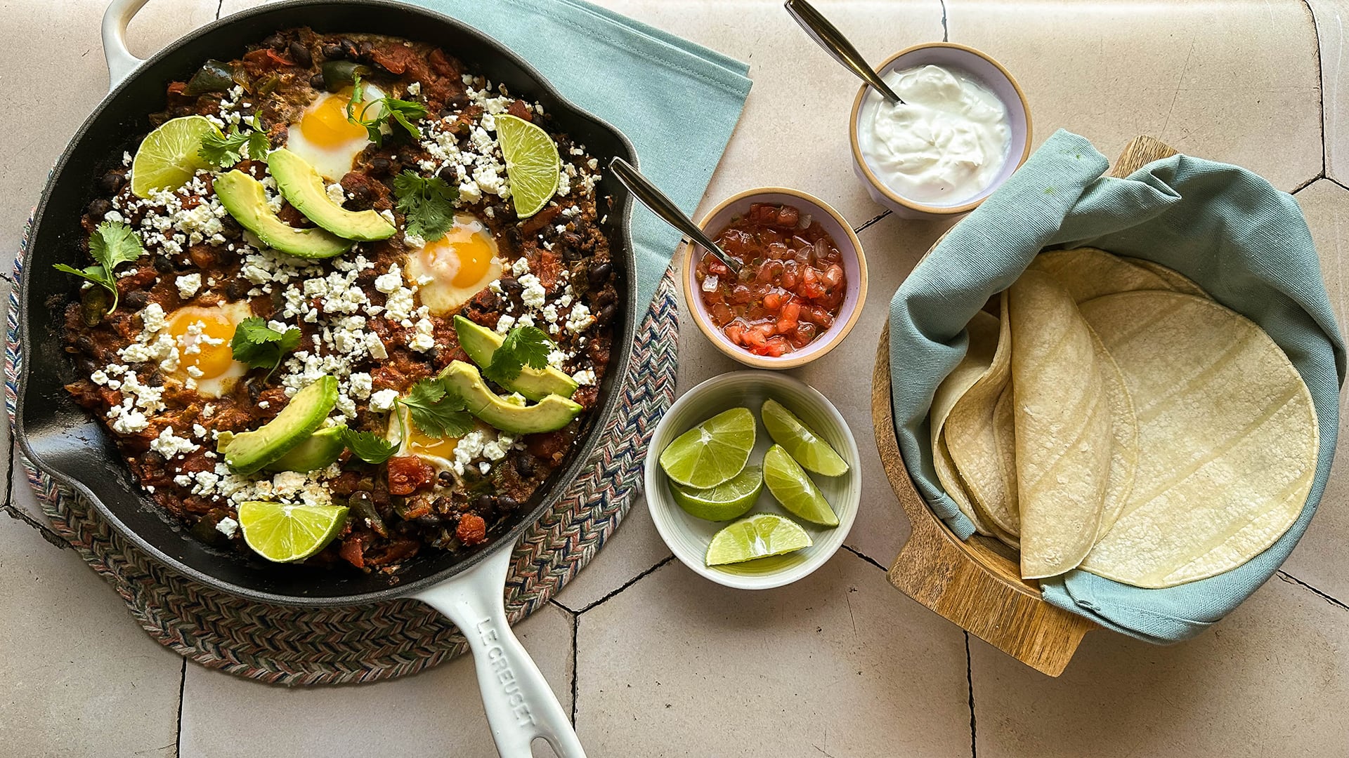 - Remove the lid and garnish with the avocado, feta, cilantro, and lime wedges. Serve with warmed corn tortillas or corn chips as well as some sour cream and pico de gallo or salsa, if desired. Enjoy!
