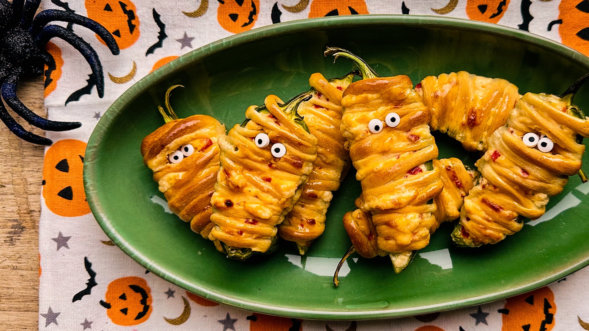 The perfect spicy and creamy appetizer. Crescent rolls wrapped around jalapeno peppers stuffed with cream cheese, roasted red peppers, and cheddar cheese.