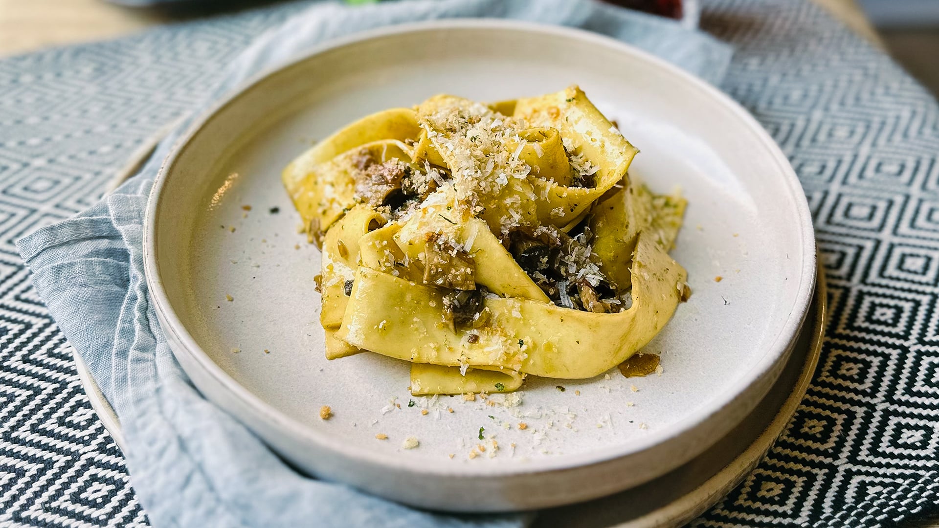 This pasta is packed with meaty flavour thanks to the bacon and porcini mushrooms.