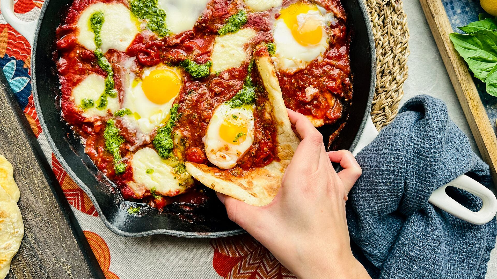 Pizza for breakfast? Sign us up! Mary Berg shares a quick, hearty egg recipe with a pizza pesto twist.