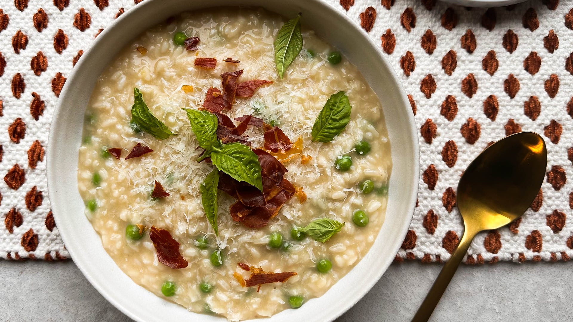 - Chop or crumble the prosciutto and serve scattered over the risotto.