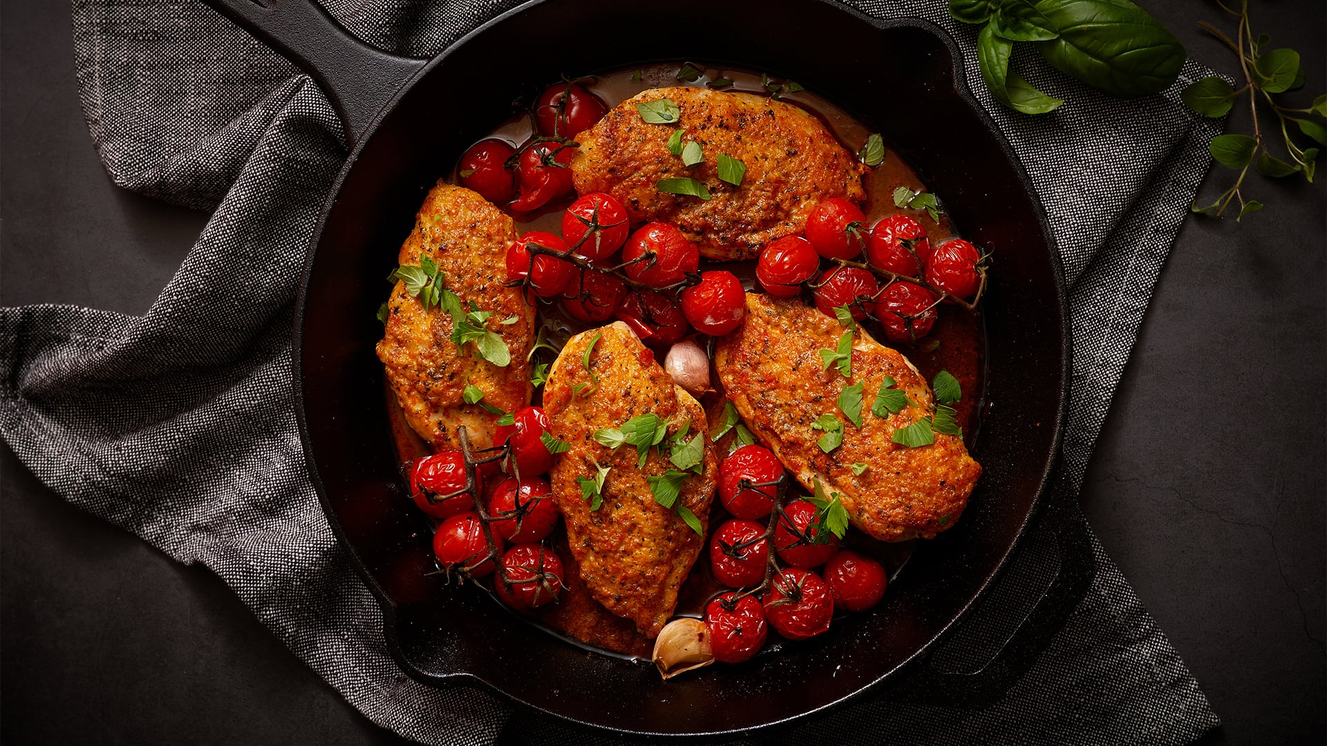 TIP: If you do not have cherry tomatoes to nestle in with the chicken, roughly chopped and seeded tomatoes will work in their place.
