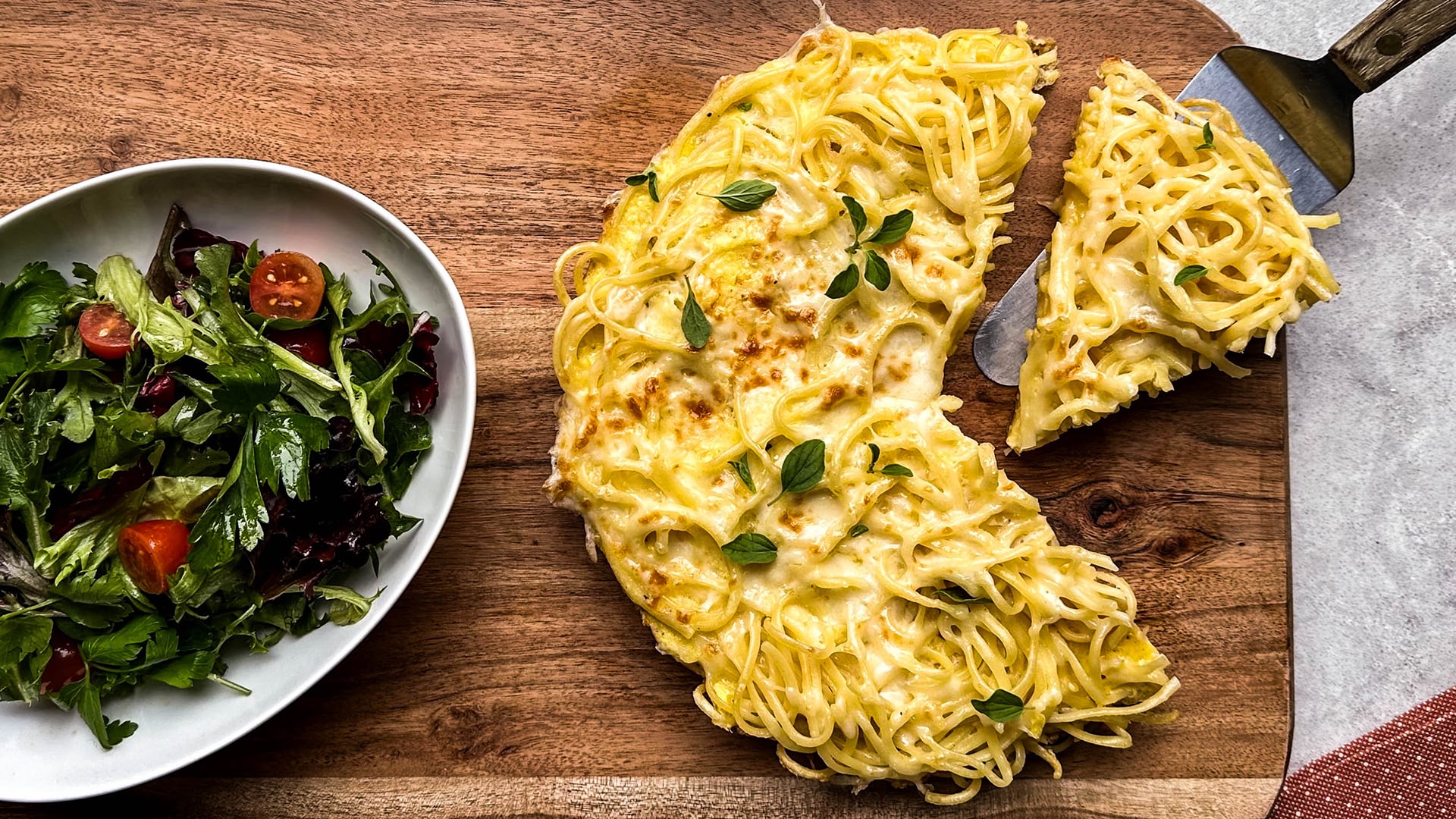 - Beat the eggs in a medium bowl, add the cheese, and season with salt and pepper. Add any leftover mix-ins such as cooked bacon, veg, herbs, or greens if desired. Stir through the cooked pasta. Add the butter and oil to the pan to melt, then add the pasta and egg mixture. Cook for three to five minutes or until the bottom is set.