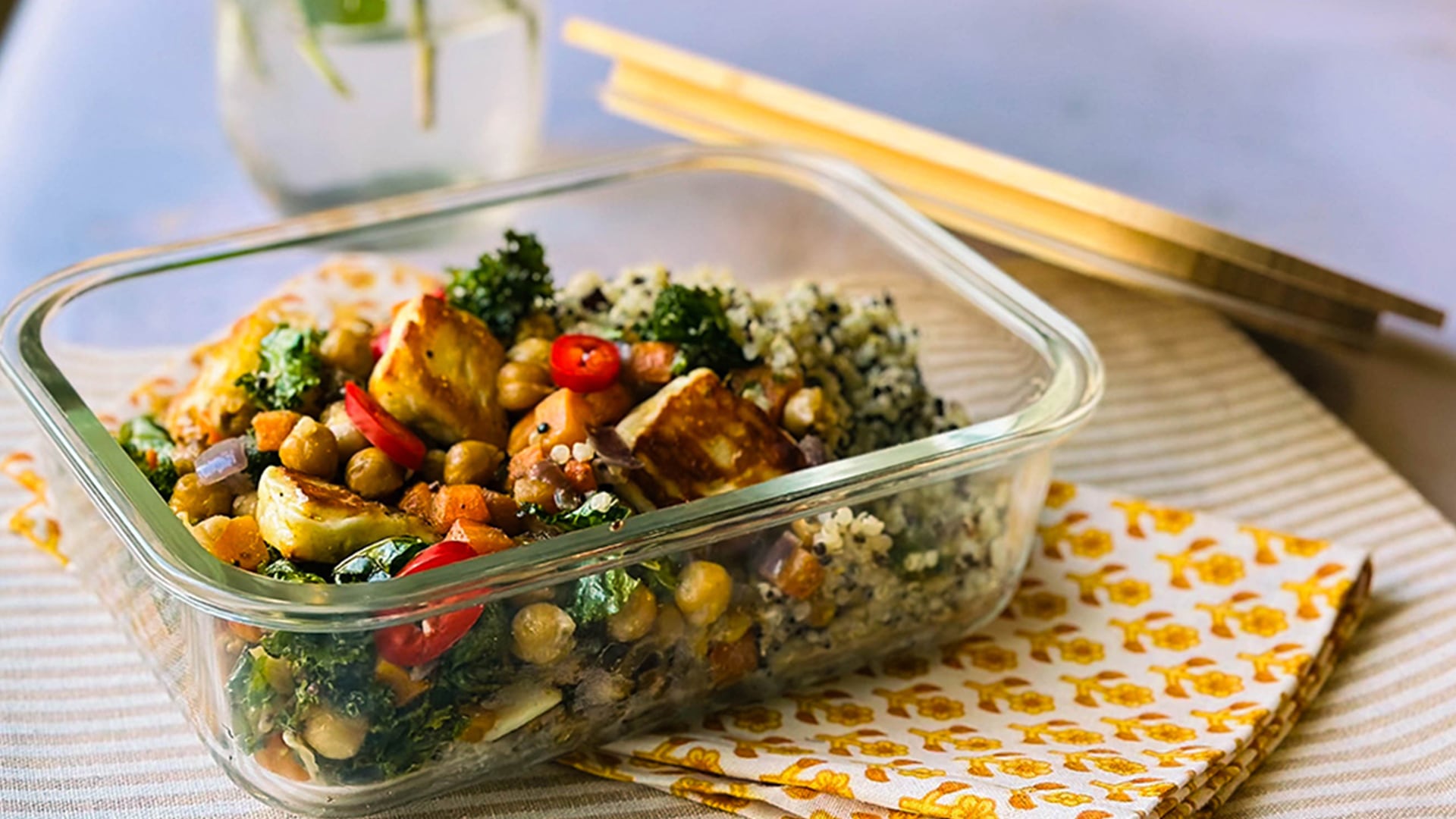 - Divide the grains over plates or into resealable containers and top with the roasted veg and halloumi.
