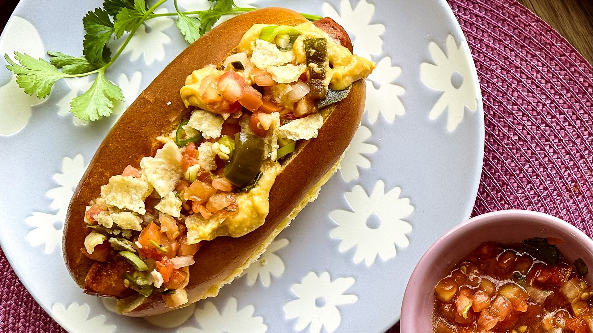 A lightly toasted hot dog bun is perfect for veggie hot dogs, topped with homemade cashew sweet potato queso, cilantro, and pico de Gallo.