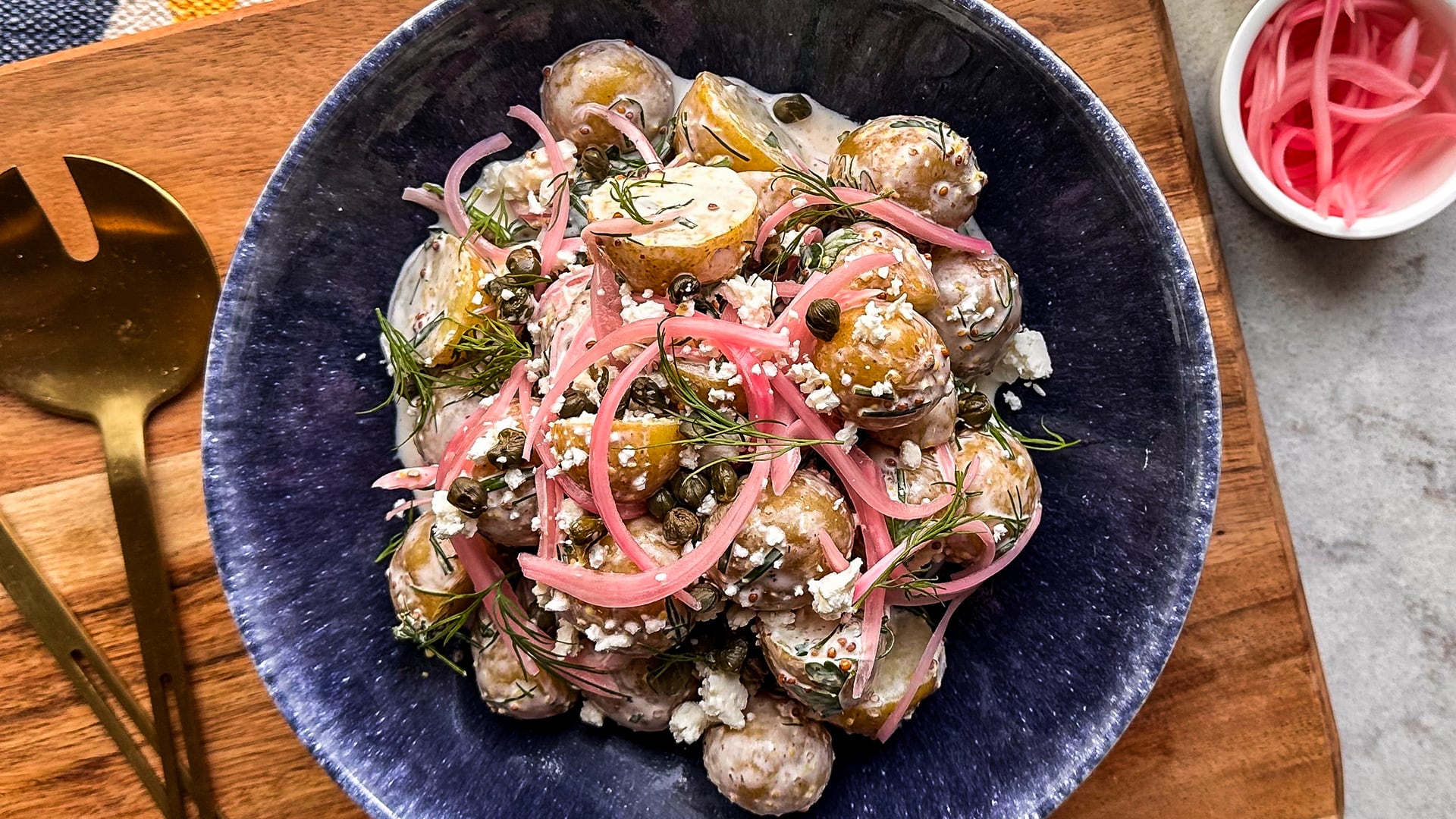 - In a large bowl, whisk together the mayonnaise, mustard, lemon zest, lemon juice, and a splash of the onion pickling liquid. Season with salt and pepper and add in the warm potatoes and herbs as well as most or all the pickled onions. Toss well to combine and transfer to a serving platter or bowl.