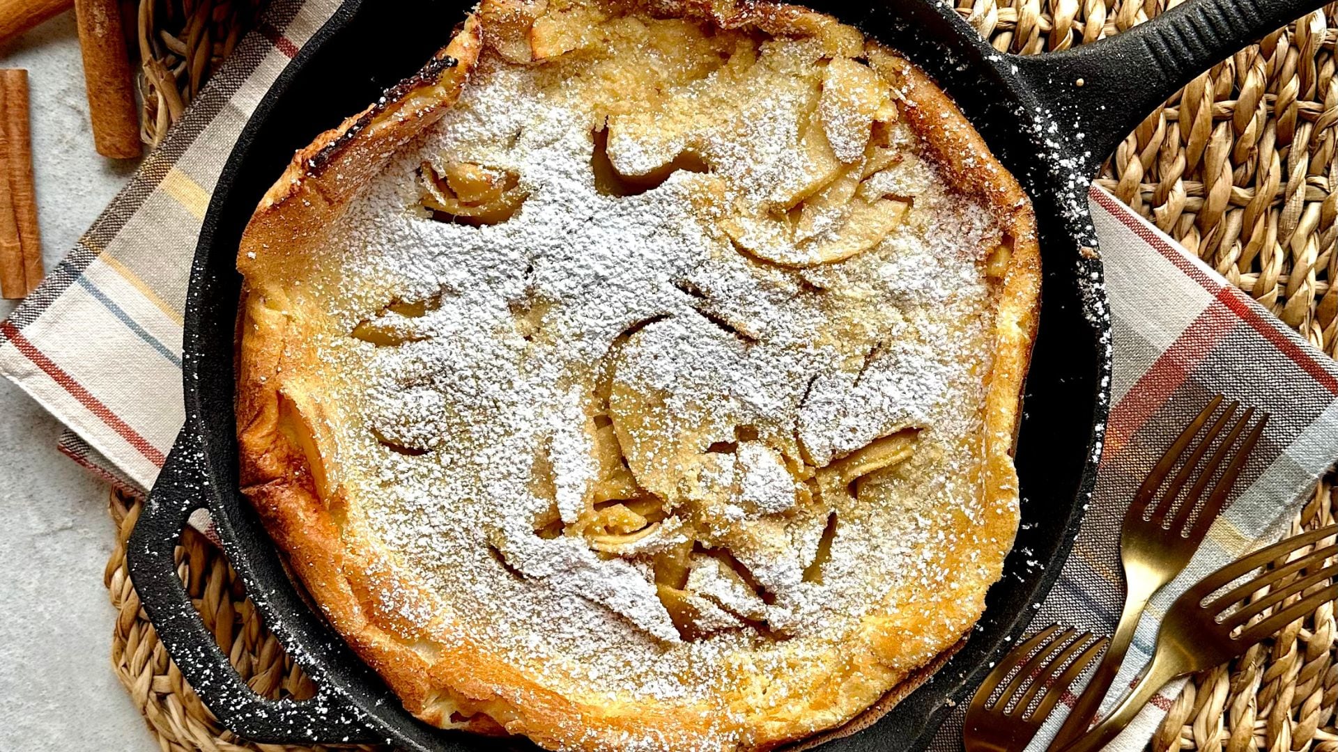 - Wipe out skillet and heat in oven until very hot, 8–10 minutes. Carefully add remaining 2 tablespoons butter to skillet, tilting to coat bottom and sides. Add apple to center of skillet; pour batter over. Bake until pancake is puffed and golden brown around the edges and center is set but still custardy, 12–15 minutes. Put a large plate on top of the cast iron frying pan and invert.