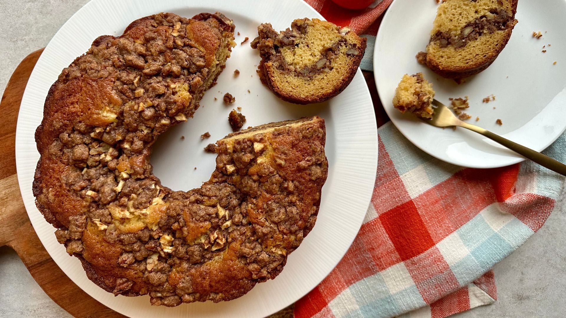 - To assemble, pour half of the cake batter into the prepared pan then evenly scatter with half of the streusel mixture. Carefully cover with the remaining cake batter and, finally, top with the remaining streusel mixture.