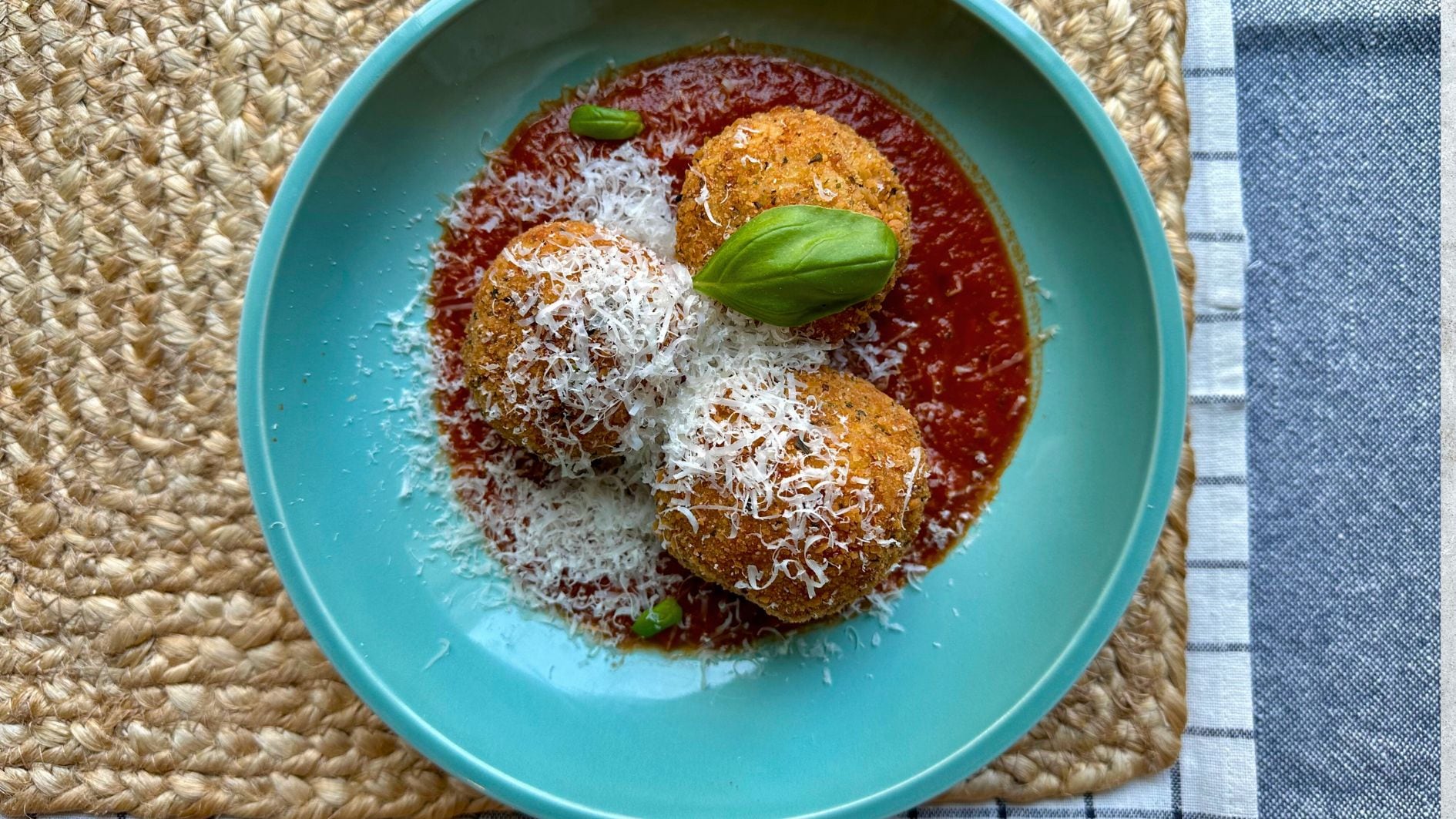 - To serve. Spread some marinara sauce over the bottom of a plate and top with the arancini. Garnish with Parmigiano. Garnish with Basil