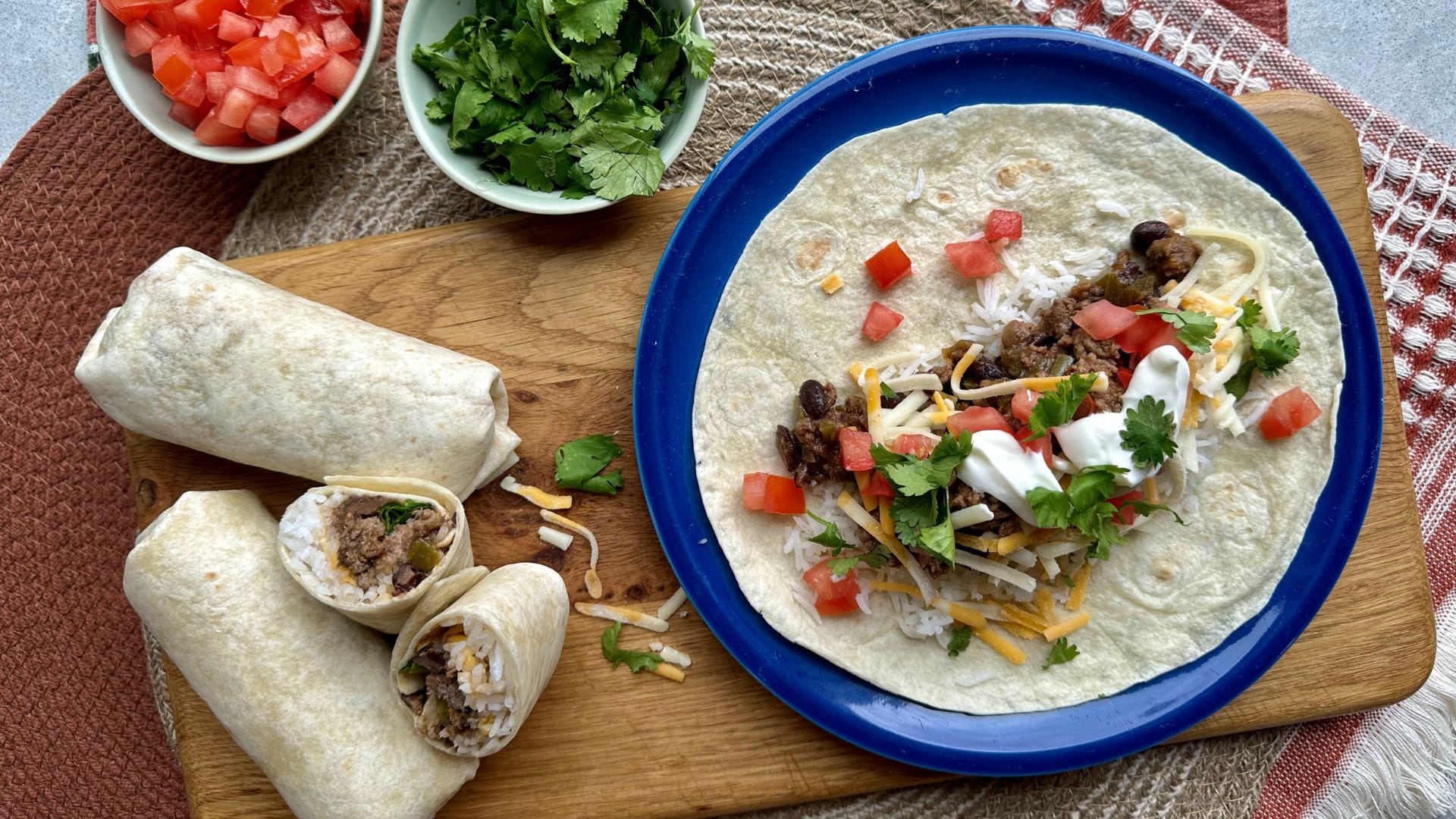 - Assemble garnishes. Place tortillas on small sheet of parchment paper or plastic wrap on the work surface. Add approximately ⅓ cup of rice and a ½ cup of beef mixture along the one third a tortilla. Top with chosen garnishes. Roll burrito up tightly by folding the tortilla over the fillings, tucking in both side edges and continuing to roll. Secure each roll in the plastic wrap or parchment sheet. Place the parcels in a large freezer bag and place in the freezer.