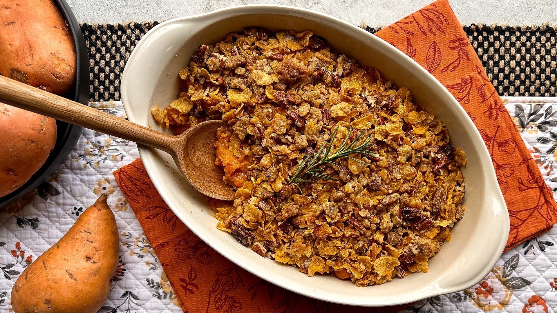 - In a medium bowl, make the topping. Stir together the flour, brown sugar, pecans, crushed corn flakes, sage or rosemary, and salt. Pour in the remaining browned butter and stir into a crumbly mixture. Scatter evenly over top of the sweet potatoes.