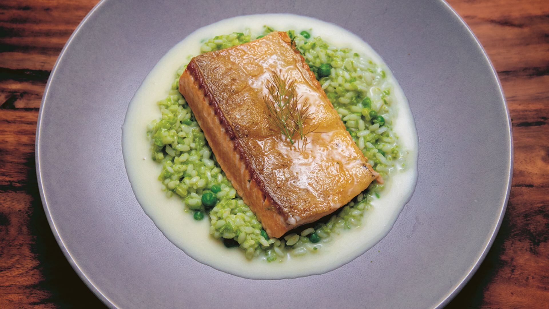 - To serve, spoon the risotto into shallow bowls or rimmed plates. Place the fish crispy skin side up on top of the risotto. Spoon the butter sauce around the fish and risotto.