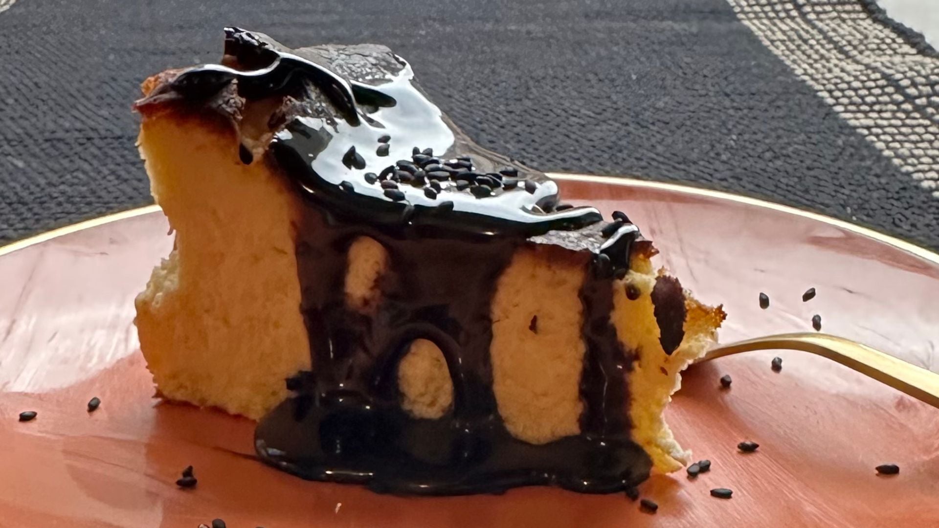 - Once the cheesecake is chilled and set, release it from the pan and peel back the parchment. Spoon the black cocoa caramel sauce over the top, letting it drip into the cracks. Slice and enjoy!