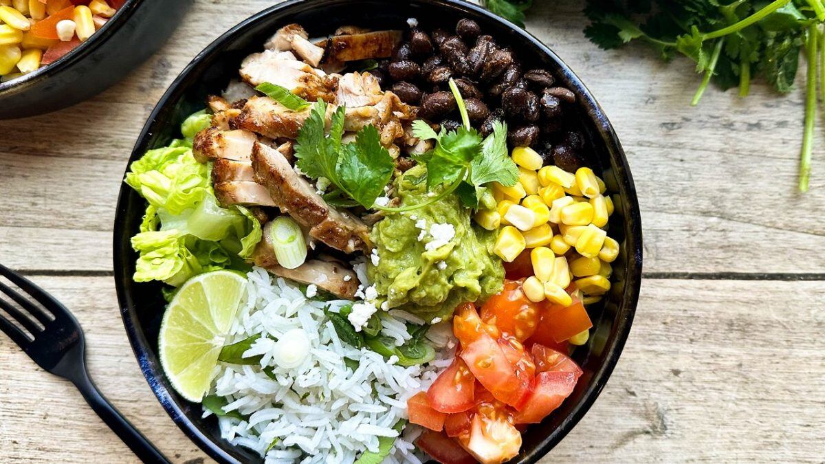 - Toss the beans with the oil and Tex-Mex seasoning to assemble the bowls. Thinly slice the chicken, if using. Divide the rice into bowls and top with protein, beans, lettuce, tomatoes, green onion, corn, guacamole, and feta cheese. Garnish with a lime wedge and some cilantro. Enjoy!
