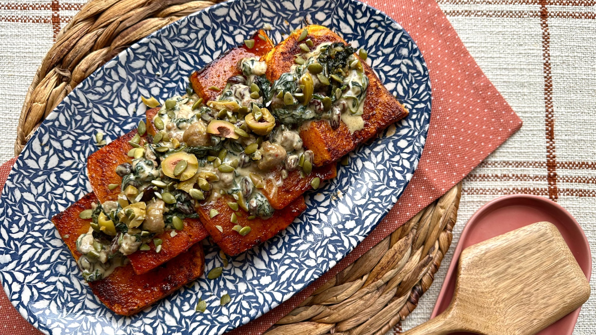 - Place the squash slices on a baking sheet. Brush each side with olive oil. Season with the smoked paprika, cayenne pepper, salt and pepper. Bake on the middle rack for 12 minutes. Flip the squash slices over and bake for another 12-15 until the squash is tender and golden brown.