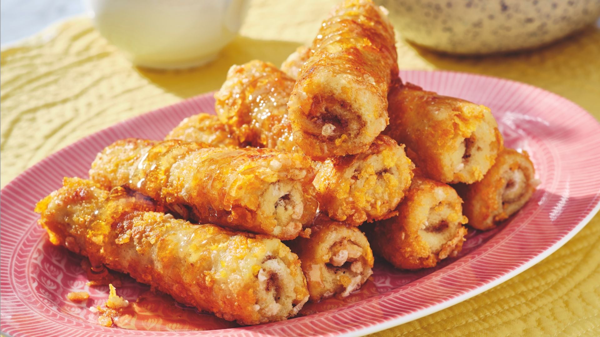 - Dip 1 French toast roll at a time in the egg mixture, letting some of the excess drip off Gently press into the cereal to coat well.