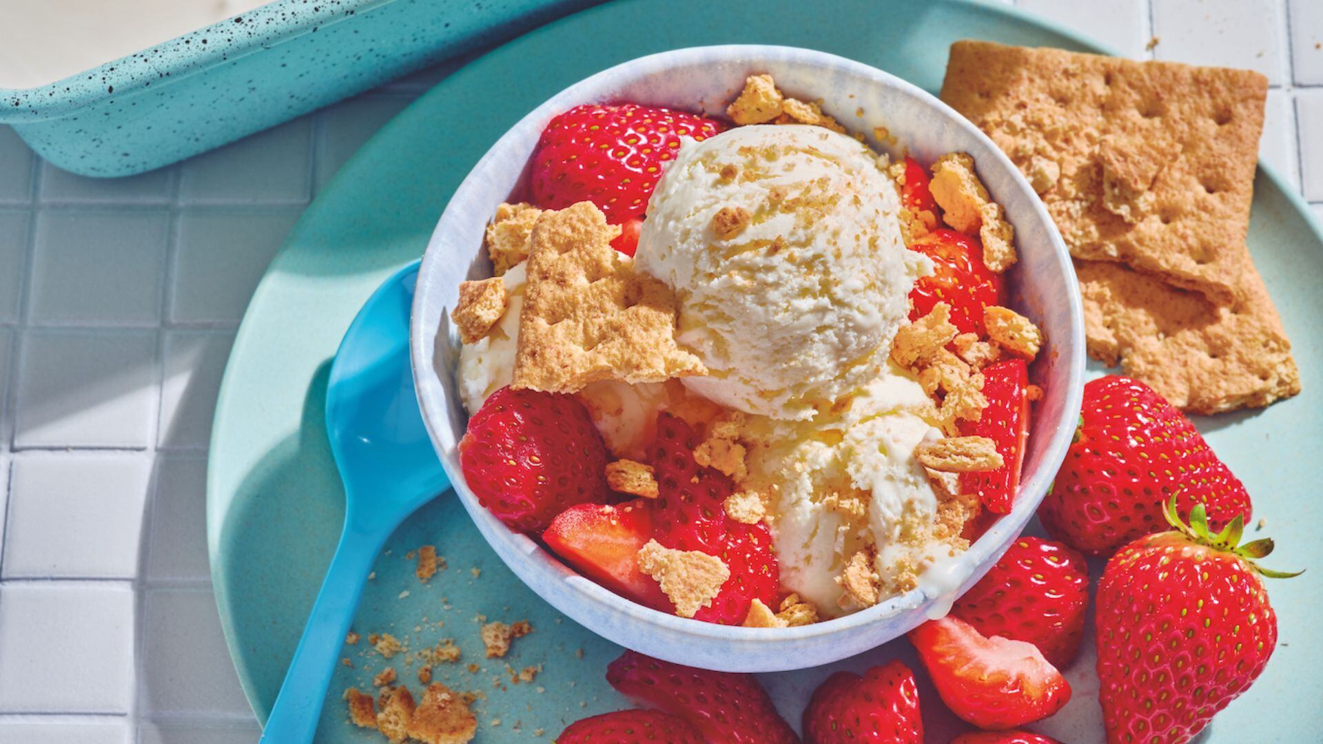 - Before serving, let the ice cream sit out at room temperature as needed to soften slightly Place scoops of ice cream in a bowl. Garnish with strawberry wedges and pieces of graham cracker. Serve immediately.