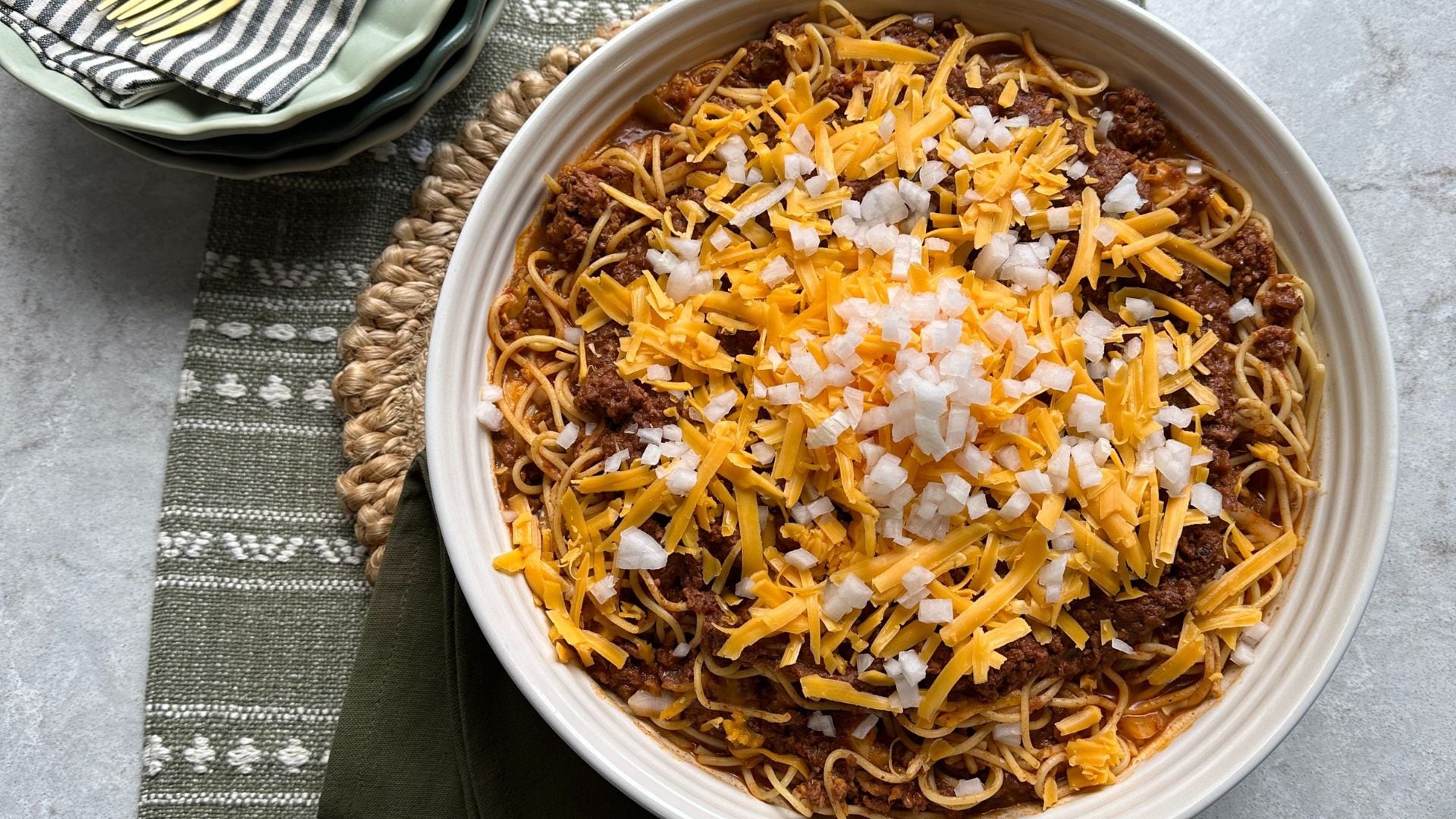 - Place a portion of spaghetti into a bowl and top with the chilli. Garnish with cheese and white onions.