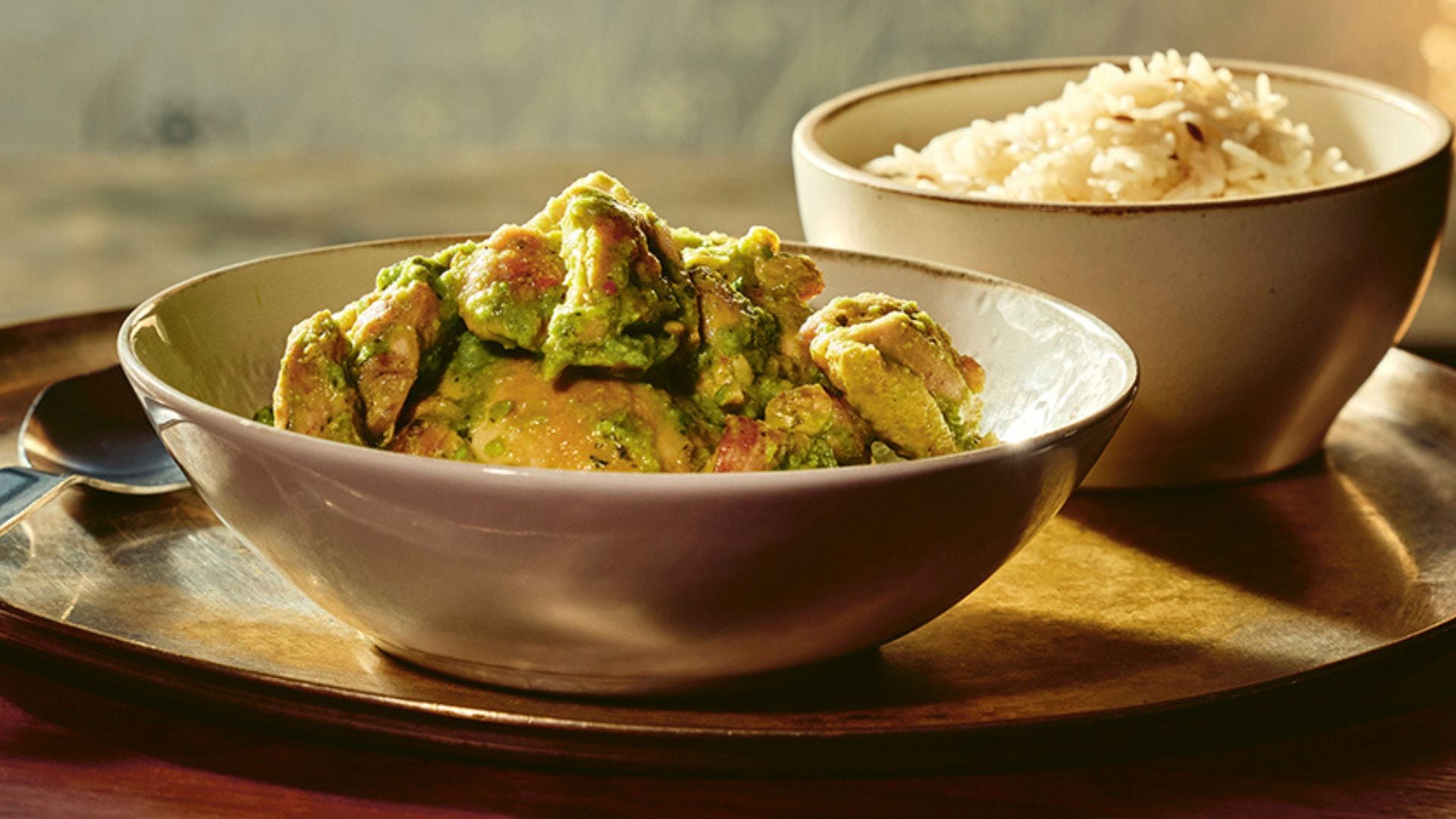- In a blender, combine cilantro, chilies and mint and purée. Stir this mixture into the sauce. Serve hot with rice or naan.