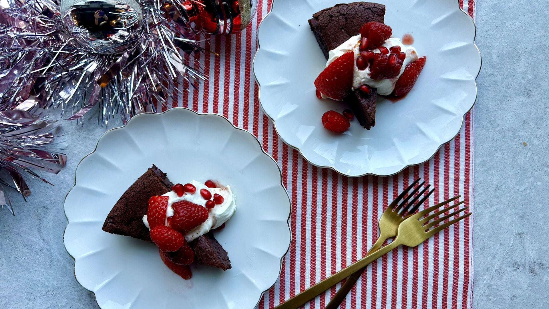 Recipe Note: The top of the cake will fall once you take it out of the oven, but that’s all part of the plan. It makes for a super fudgy cake.