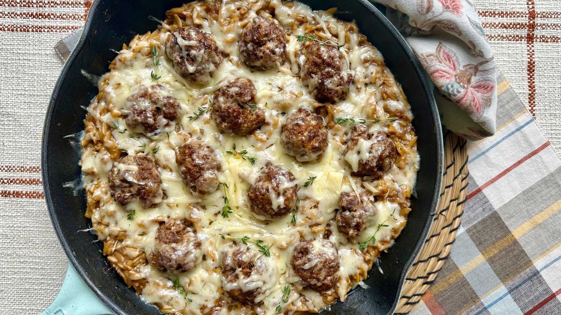 - While the meatballs roast, prepare the orzo. Place the pan with the caramelized onions back over medium heat. Scatter in the flour and cook for 1 minute just to toast. Whisk in the wine and simmer for about a minute then whisk in the beef broth and thyme. Turn the heat up to high and bring to a boil. Add in the orzo and cook, stirring frequently, for 10 to 12 minutes or until al dente. Remove the sprigs of thyme and season with salt and pepper, to taste.