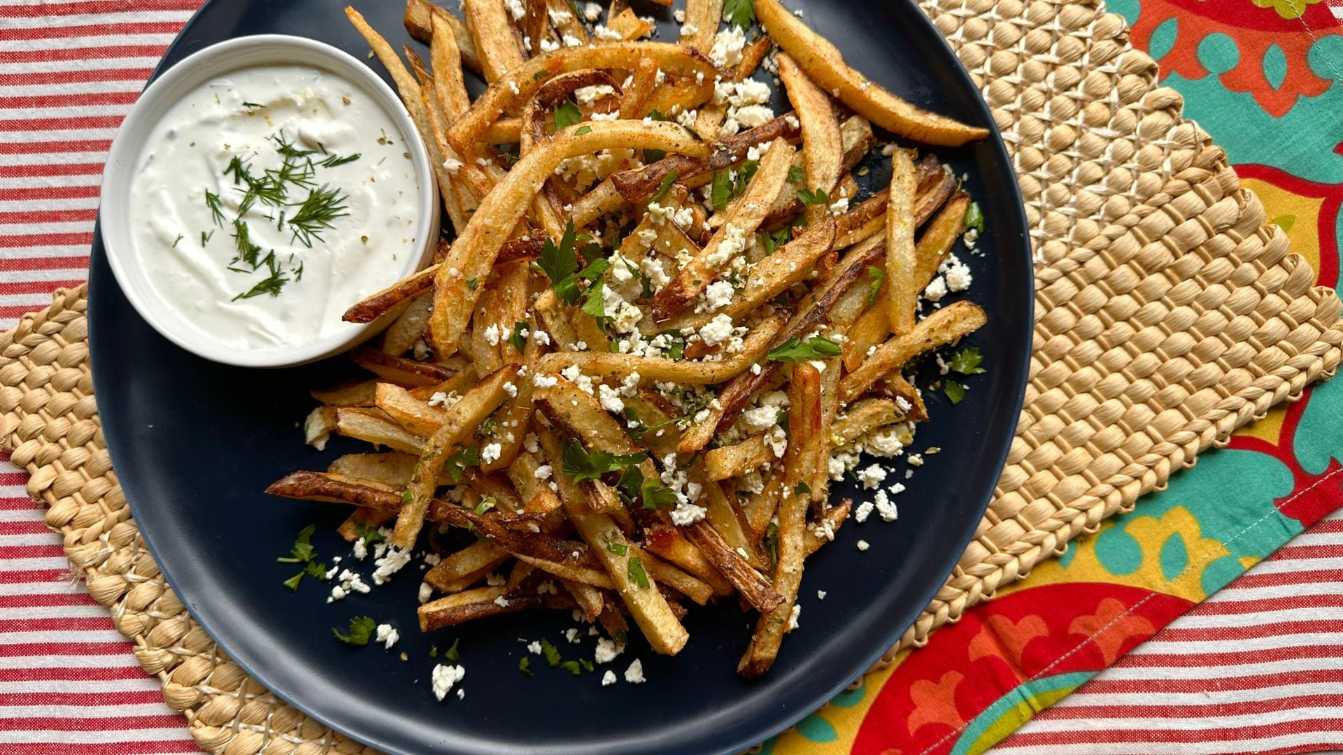 - While the fries are still warm, toss with lemon zest, olive oil, oregano, pepper, and feta.
