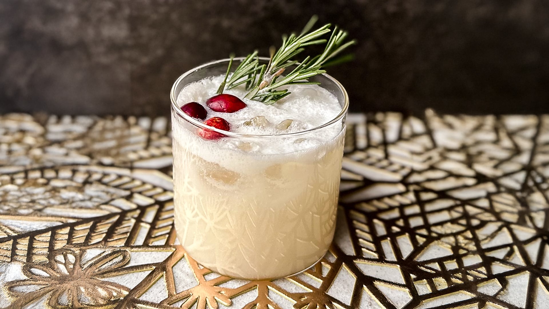 - Shake all ingredients and strain into a rocks glass. Garnish with Cranberry and Rosemary