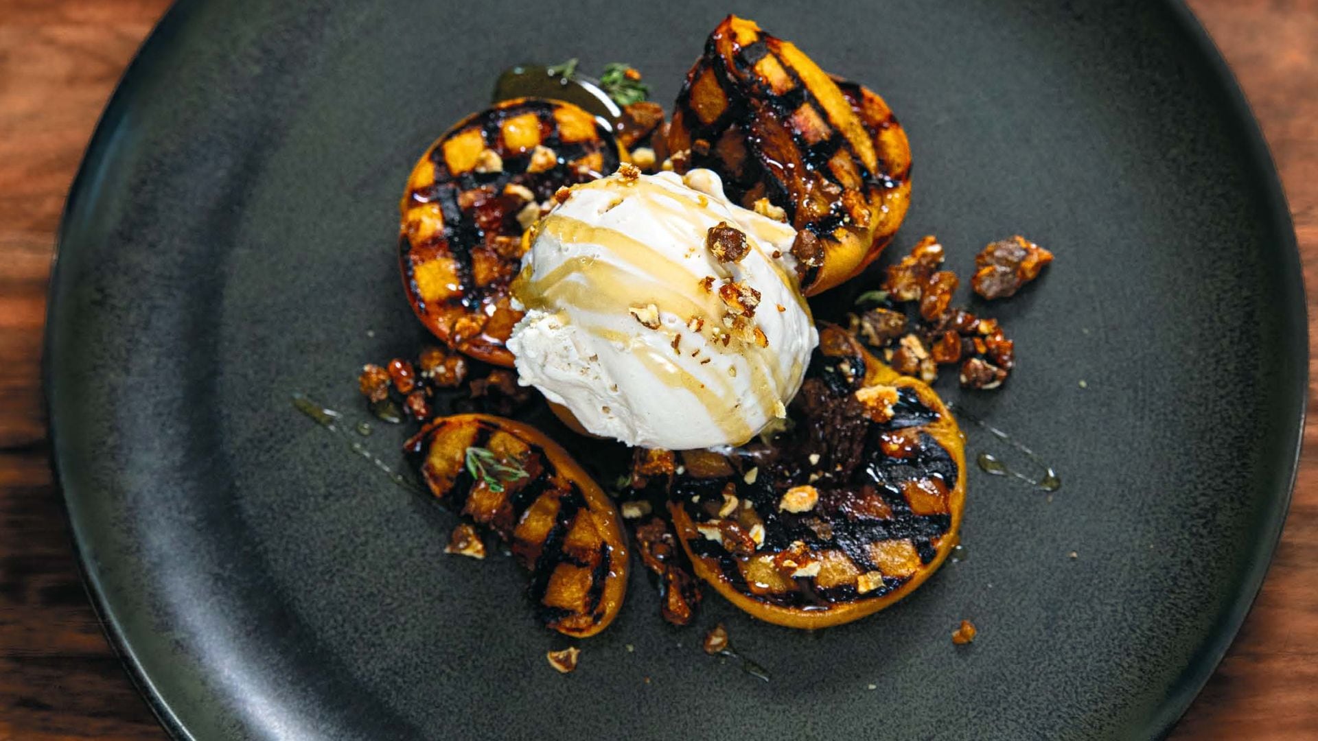 - Arrange the peaches grilled side up on plates. Scoop the vanilla ice cream on top. Drizzle with wildflower honey, sprinkle with toasted walnuts, and garnish with thyme, if using.