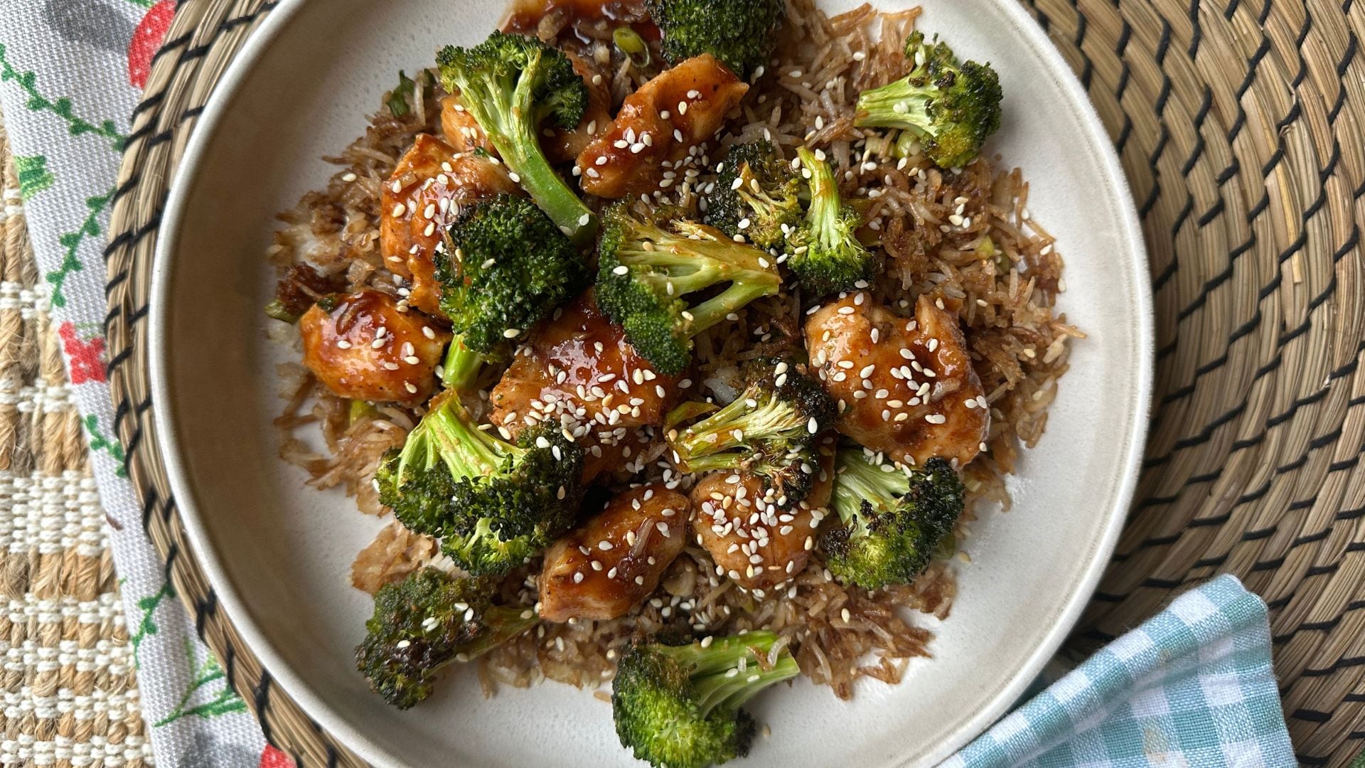 - To serve, divide the rice amongst serving plates or low bowls. Pour the sauce over the chicken and broccoli and toss well to evenly coat. Divide the saucy chicken and broccoli between the serving dishes and scatter with some green onions and toasted sesame seeds.