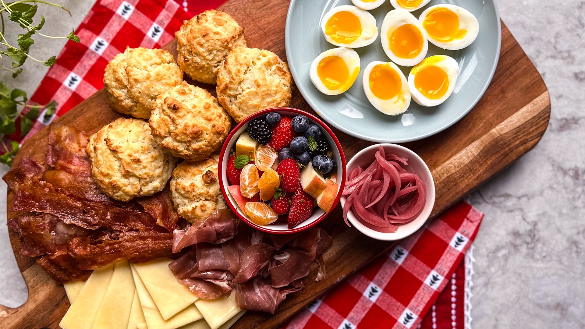 Recipe Note: Feel free to make as much or as little of this board as you’d like. Sometimes, I’ll just make the biscuits, soft boil eggs, and set that out with whatever leftover meats and cheeses I have from last night’s charcuterie board.