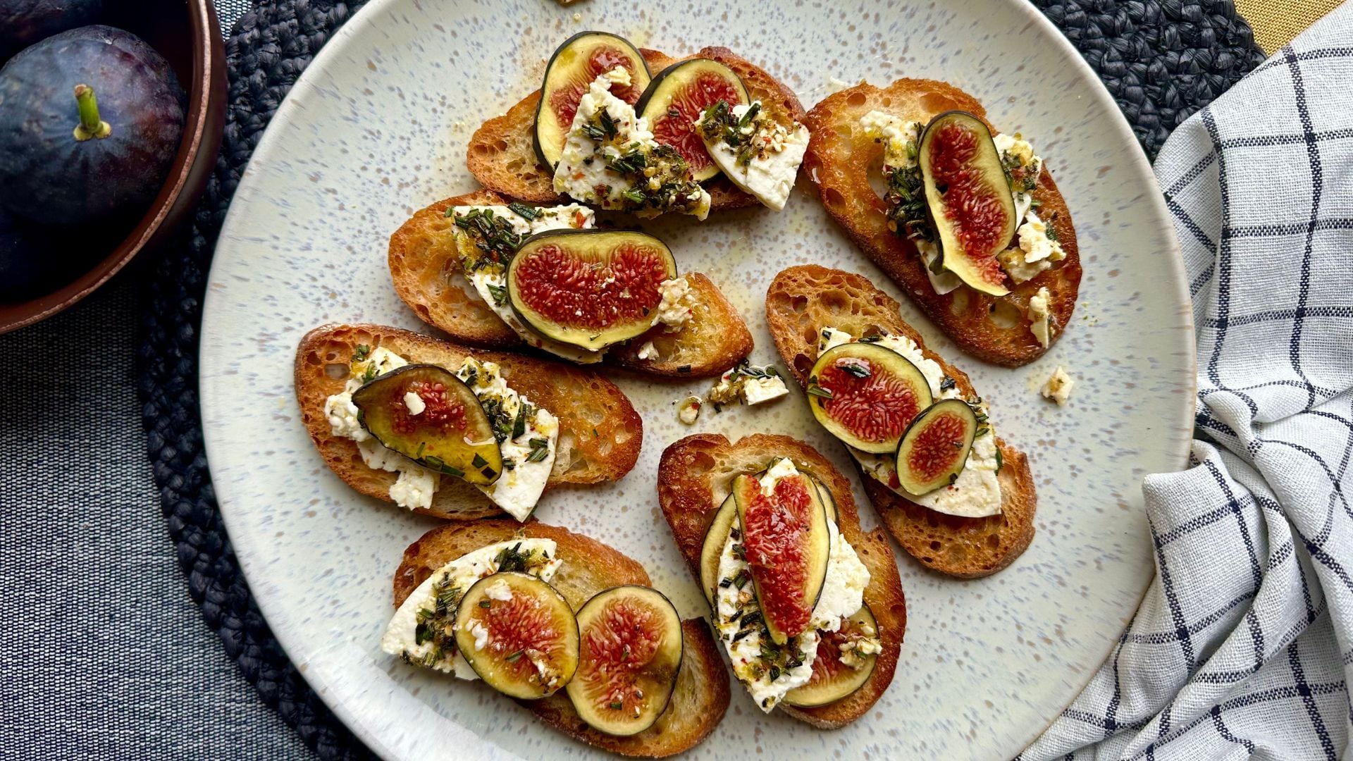 - Place a sliced fig on the crostini (recipe here), drizzle with a little of the marinade from the feta. Top each fig with a piece of feta. Serve.