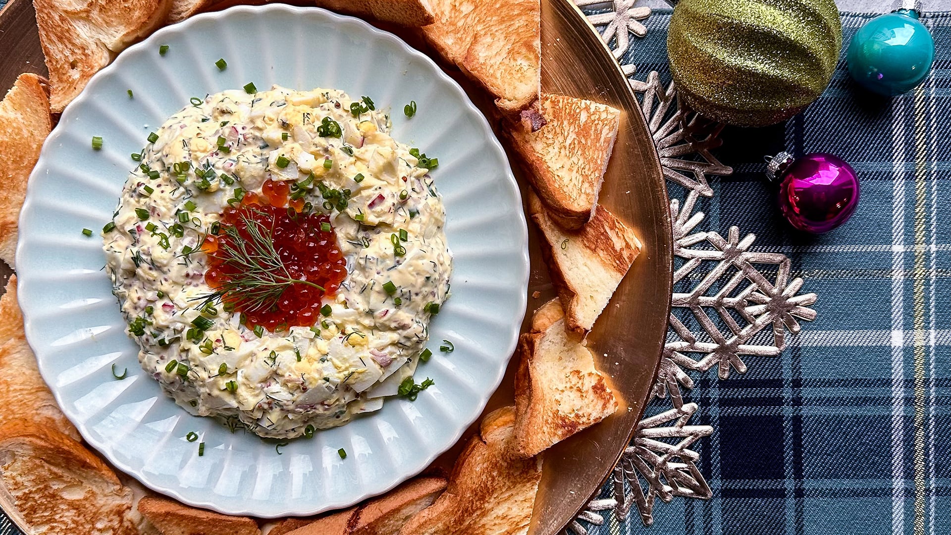 - To serve, transfer the egg salad to a serving dish with the toast on the side. Place the caviar in the container it came in or a small dish over ice to keep it cold. Spread or dollop egg salad onto a triangle of toast and top with some caviar and chopped chives.