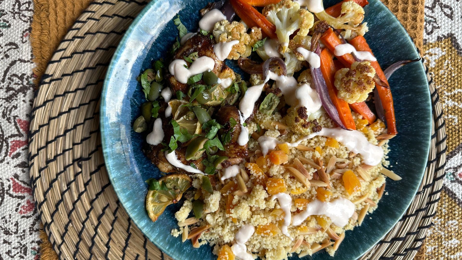 - To serve. Scoop out some couscous onto a plate, top with two pieces of chicken, spoon over some juices and olives from the baking sheet. Add vegetables on the side. Drizzle everything with some of the yogurt sauce.