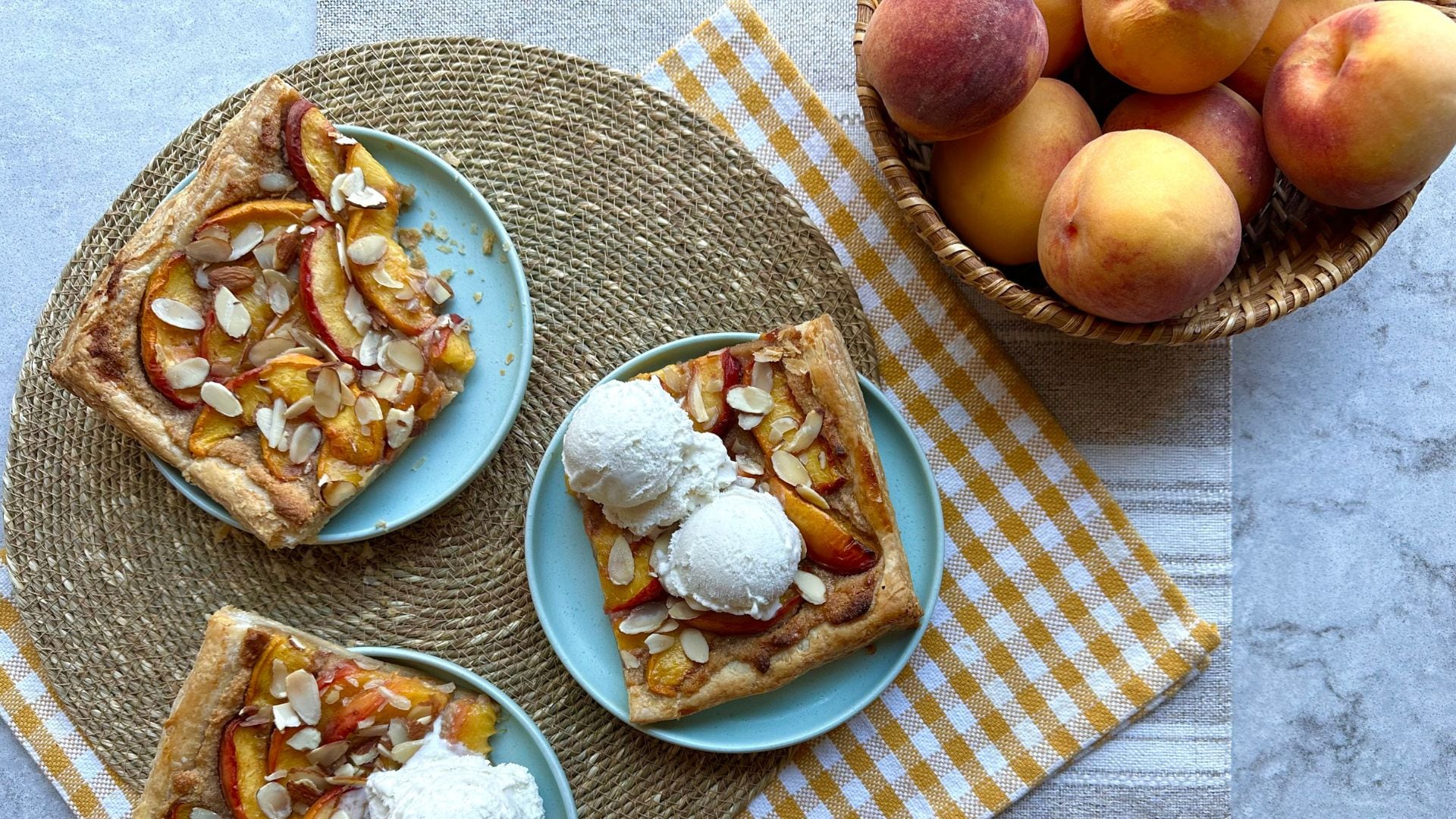 - Retrieve the pastry from the fridge and spread the frangipane overtop leaving about a 1cm border all the way around. Arrange the peaches on top in an even layer. Scatter the almonds overtop.