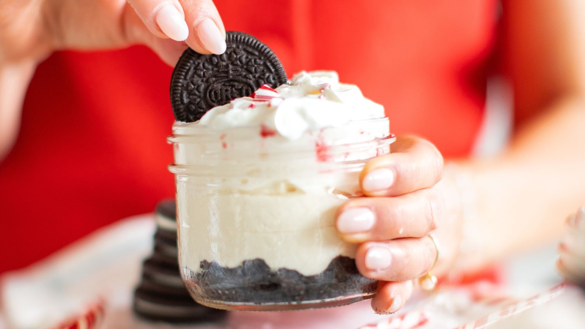 - Make the cheesecake filling: In a medium bowl using an electric mixer, mix together thecream cheese, sugar, vanilla, and peppermint extract until smooth. In a separate bowl,whip the whipping cream until stiff peaks form. Add the whipped cream to the creamcheese andbeat just until smooth and combined. Divide the mixture evenly among thejars, cover, and refrigerate until ready to serve, at least 2 hours or up to 3 days.