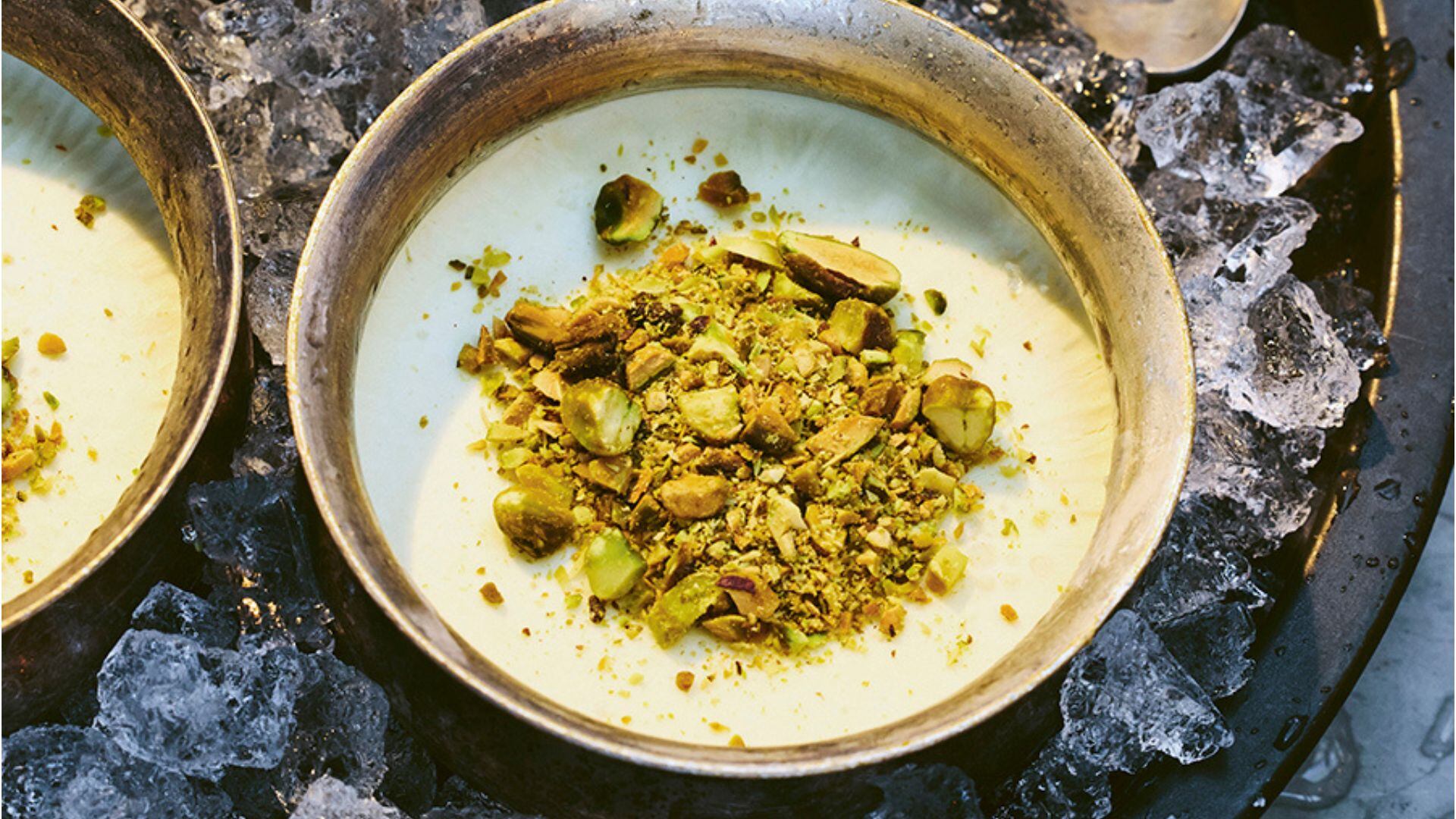 - Pour mixture into small serving cups. Garnish with the remaining chopped pistachios and almonds and cover with plastic wrap. Freeze for at least 6–8 hours, until completely set.