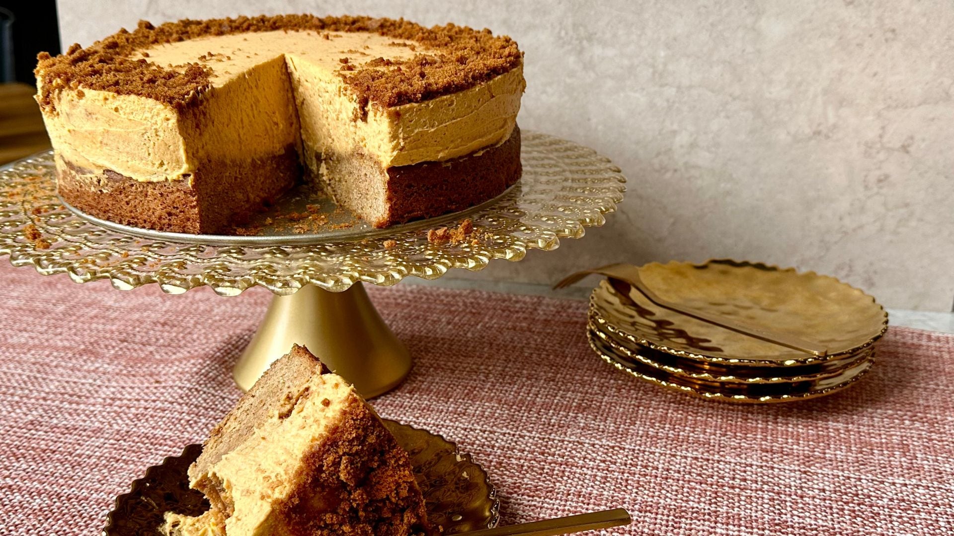 - Once the blondies are cool, prepare the cheesecake layer. Use a hand mixer to beat the cream cheese, pumpkin puree, and vanilla together in a large bowl until smooth. Scrape down the bowl and add in the brown sugar, icing sugar, and pumpkin pie spice. Beat until smooth and creamy, about 1 minute.